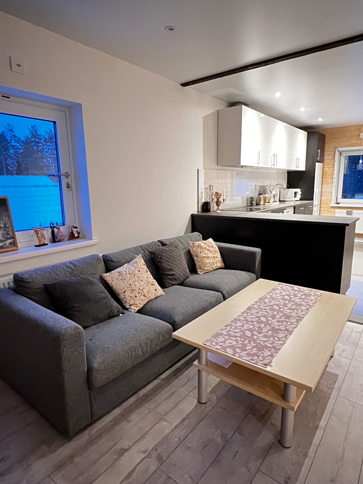 Enskil stuga i skogen , med friliggande vedeldad bastu. (4+1 bäddar) I stugan finns kök och wc, sovrum med en queen (140cm) säng samt våningssäng (2st90cm). Vardagsrum med matbord och stor soffa samt vedkamin Fem minuter till två olika sjöar var av en av dem finns allmän badplats , i den andra sjön finns tillgång till plast eka om så önskas, fiske kort går att lösa. Stugan är utrustad med de flesta kökstillbehören samt utegrill. Önskas sänglakan och handuk erbjuds det för 100sek/person.