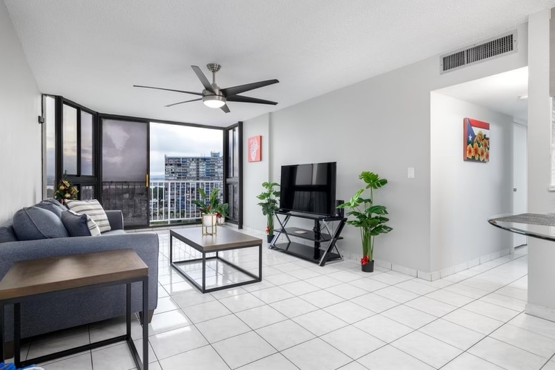 Enjoy a relaxing and fun experience at this centrally-located place. A fully renovated and equipped apartment with an amazing view, swimming pool, famous Beach access, playground, exercise equipment, high speed WiFi for work and enjoyment, basketball and tennis courts. This location is at a walking distance from various restaurants, casinos and pharmacies. Plus it’s near to many mayor attractions, malls and the only USA Rain Forest “el Yunque”. Includes free parking and 24 hour security.