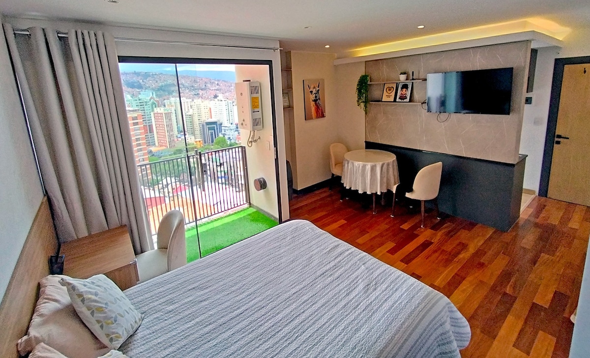 Cozy apartment with spectacular view of La Paz! Enjoy staying in one of the best, safest and most exclusive zones of La Paz: San Jorge. You'll be near supermarkets, movie theaters, malls, pubs, cable car and the Spain and US embassies. The apartment includes 30mbps fiber internet, fully equipped kitchen, balcony, washing machine, TV, dining table and 1 bedroom full of amenities for you to have a pleasant stay. Please, before booking, read all the listing rules :) We'll be happy to host you!