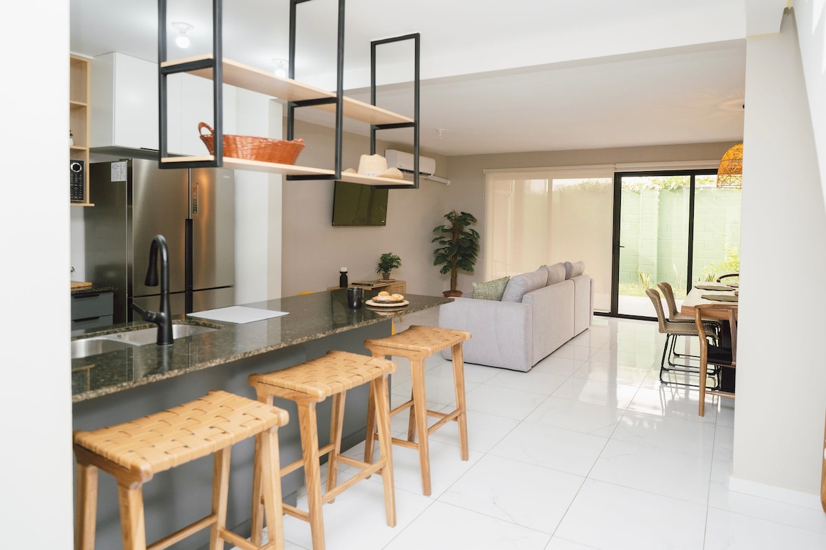 Your Home Away from Home! Relax and enjoy breathtaking volcano views in a peaceful, secure setting. Fully furnished and equipped house for up to 6 guests. Air conditioning in every room, including the living room and kitchen.. Conveniently located near shopping centers, pharmacies, restaurants, and supermarkets. Just 45 minutes from Las Flores Beach, Cuco, surf city2 and other beautiful spots. 24/7 security for your peace of mind. And many more amenities to make your stay comfortable.