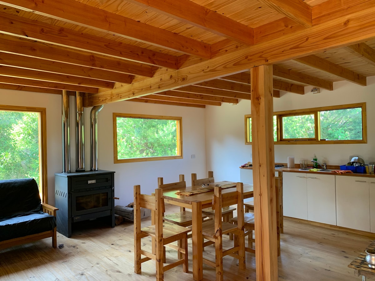 Relajate con tu familia en este tranquilo alojamiento en Lago Puelo, Casa para 5 personas equipada a full con fogón super chic a los pies de los Andes. A minutos del Lago Puelo y del Río Azul y a distancia a pie de las mejores Heladerias, Casas de té y Cervecerías de la Zona. INTERNET SATELITAL INCLUIDO.