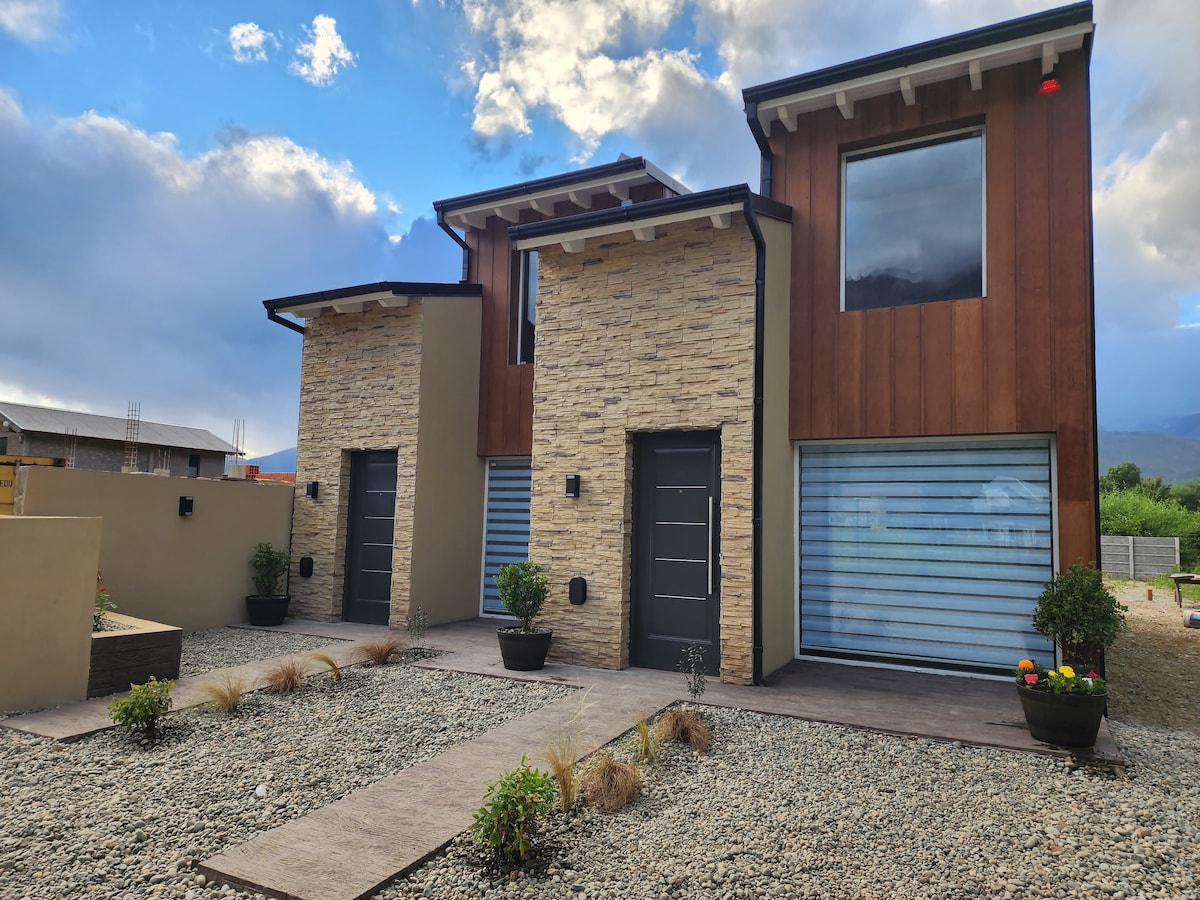 Excelente casa en 2 plantas, nueva, totalmente equipada con muebles de diseño, cocina completa, living comedor, toilette, lavadero con lavarropas, patio con parrilla y muebles de exterior en planta baja. En la segunda planta cuenta con 2 dormitorios, vestidor y baño completo. el dormitorio principal con balcón. Estacionamiento dentro de la propiedad. Ubicación excelente, tranquila, a 3 cuadras del centro. Este alojamiento elegante es ideal para viajes en grupo.