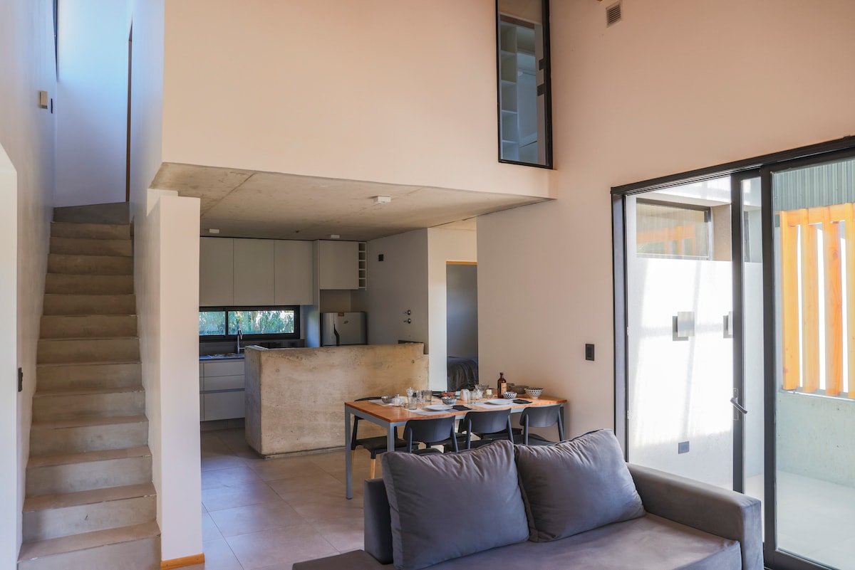 Excelente casa en 2 plantas, nueva, totalmente equipada con muebles de diseño, cocina completa, living comedor, toilette, lavadero con lavarropas, patio con parrilla y muebles de exterior en planta baja. En la segunda planta cuenta con 2 dormitorios, vestidor y baño completo. el dormitorio principal con balcón. Estacionamiento dentro de la propiedad. Ubicación excelente, tranquila, a 3 cuadras del centro. Este alojamiento elegante es ideal para viajes en grupo.
