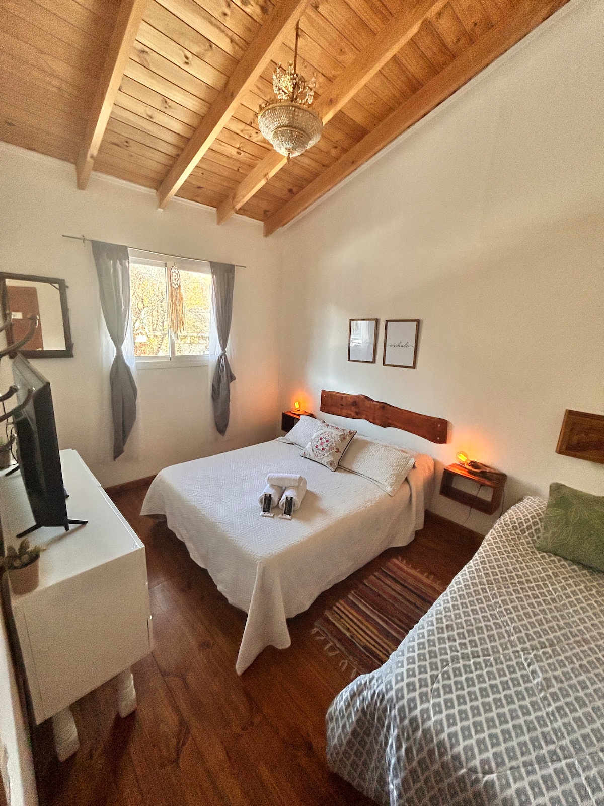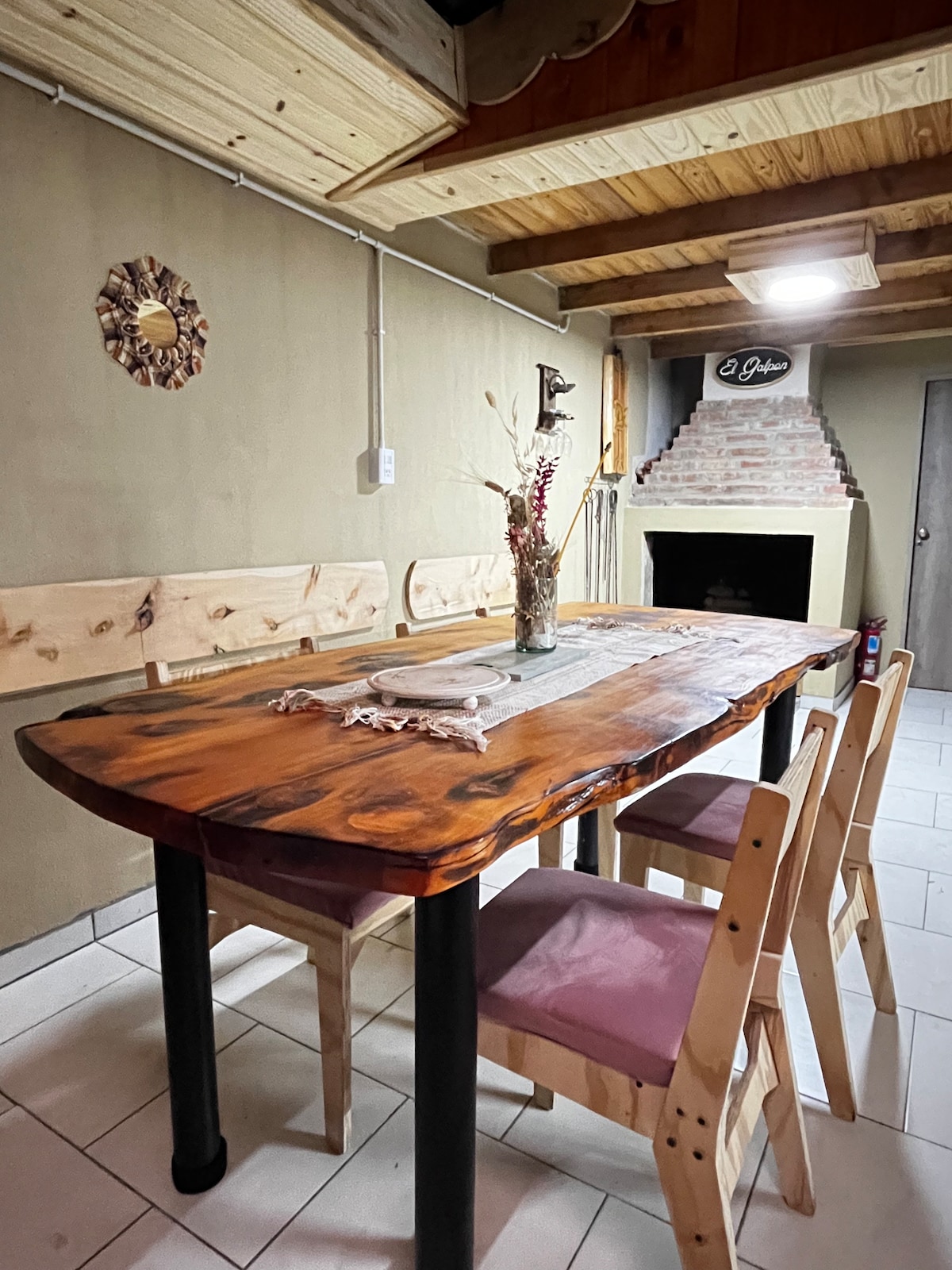 Super central and new. It has integrated living room with 2 single beds + wrought iron carricama. Smart TV 32’ in living room. Fully equipped kitchen with appliances and crockery, heating in all rooms, wardrobe + suitcase, high range wifi, full bathroom with amenities and hairdryer. Upstairs, double bedroom with Smart TV 32’ and mountain views, wardrobe and everything you need to live some beautiful days in El Bolsón.