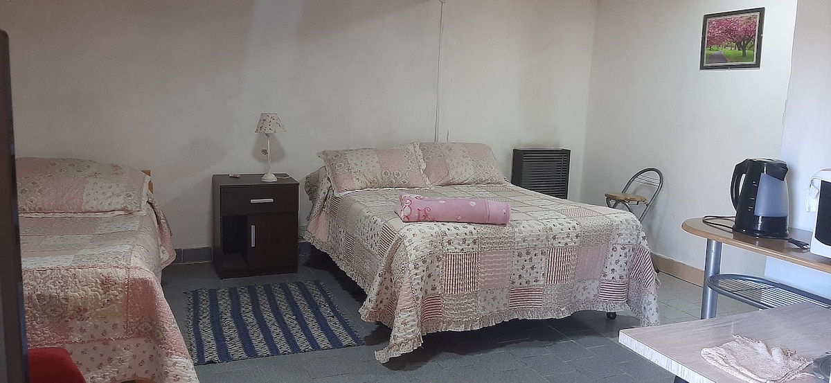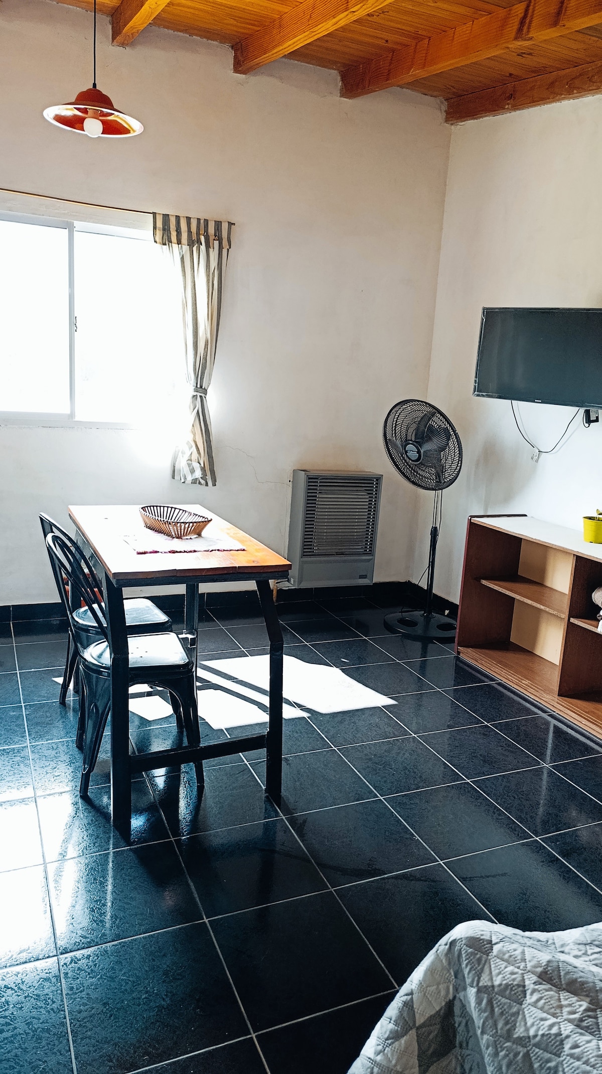 El departamento monoambiente esta completamente equipado para que se alojen cómodamente hasta 3 personas (matrimonio con un niño). Poseen WiFi, ropa de cama (sabanas y toallas), TV con DirectTV HD, calefacción con gas natural, heladera, cocina, vajilla completa, un sector para guardar y organizar ropa y equipaje, una cama matrimonial y otra individual (que sale debajo de la matrimonial), y estacionamiento vehicular al frente del mismo.