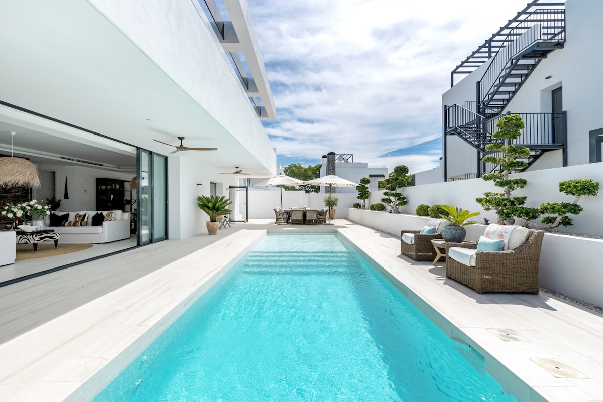 Luxury villa in prestigious area on the beach with private pool. Only 30 steps to the beach. Excellent quiet location. Chill out south-facing terrace with sea views. 15 minute walk into Puerto Banús along the beach promenade. Surrounded by hotels, restaurants, chiringuito, bars, and beach clubs. A car is not necessary, however there is a private garage and free parking on the street. *Important Notice* CLEANING AND LAUNDRY FEE OF €300 HAS TO BE PAID THE DAY YOU ARRIVE. IT IS NOT INCLUDED.