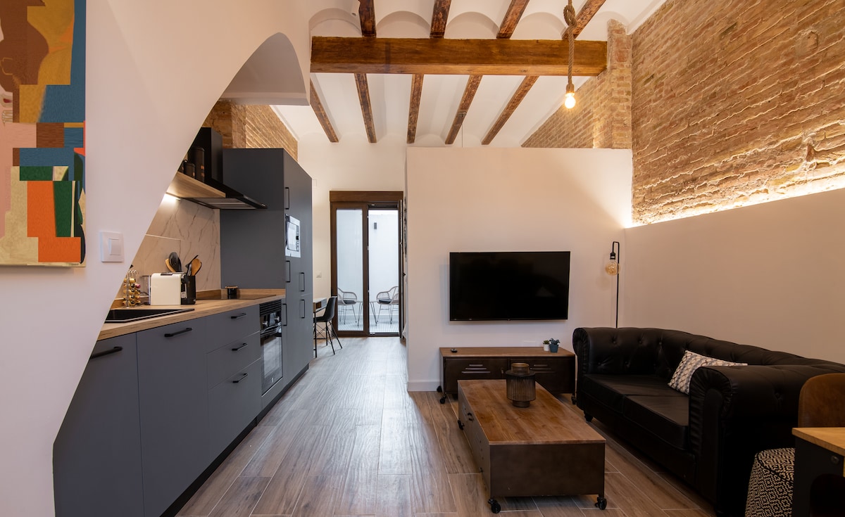 Fantástico Loft en el Cabañal cerca de la playa. El lugar perfecto para disfrutar de tu estancia en Valencia. Totalmente renovado, el loft en planta baja cuenta con una sala de estar, zona de comedor cocina, dormitorio y una terraza interior. Pueden dormir 4 personas, en una cama doble y un sofá cama comodísimos! A escasos metros de Casa Montaña, a 5 minutos de la playa y del tranvía. Muy bien conectado con el centro de la ciudad, Ciutat vella, la estación de tren, el aeropuerto, etc!!