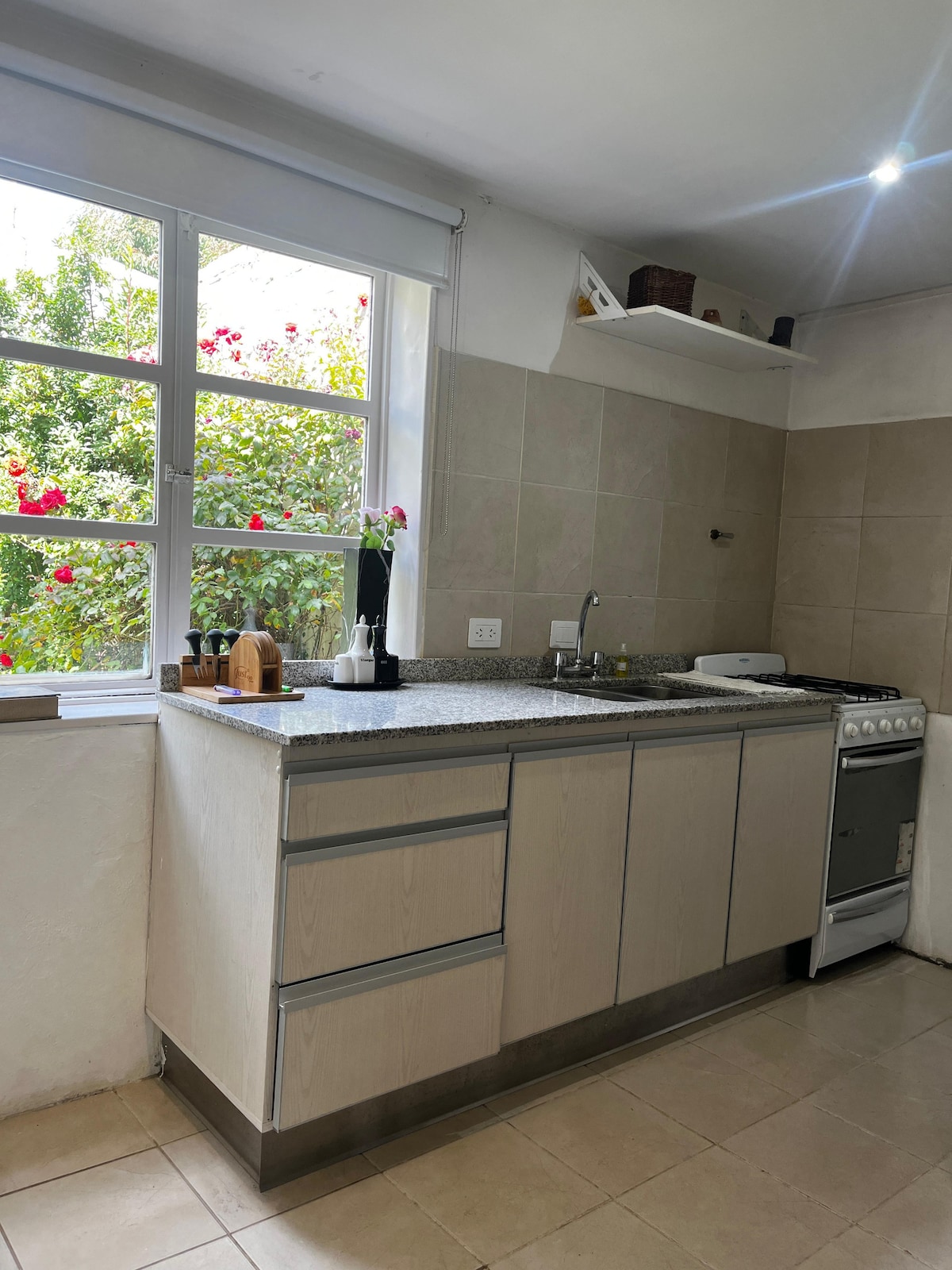 Relajate en este alojamiento único y tranquilo. Monoambiente luminoso en planta baja, con vista al cerro Calafate, equipado con todo lo necesario para que disfrutes de tú estadía. A dos cuadras de hipermercados y 6 cuadras del centro de la ciudad.