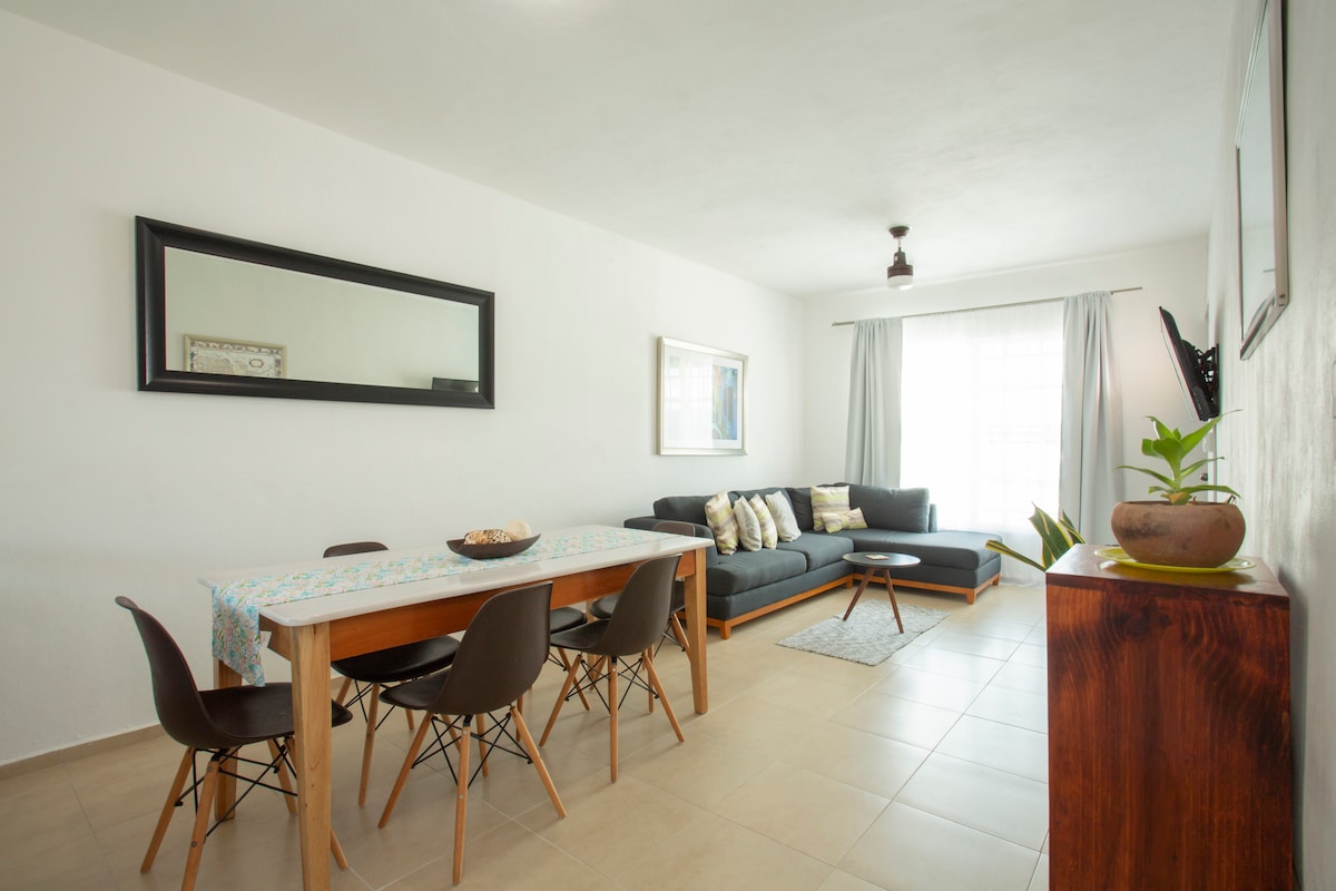 Surrounded by an oasis with great vegetation and lagoons, in this beautiful apartment you will enjoy the tranquility and comfort you are looking for, whatever porpoise for your trip. Situated in the private residential of “Lagunas de Ciudad Mayacoba”, at 15 minutes from downtown Playa del Carmen and 40 minutes form Cancun Airport. Minimalist style, spacious, comfortable and fully equipped, even for long stays. Elevator, parking lot and 24/7 security.