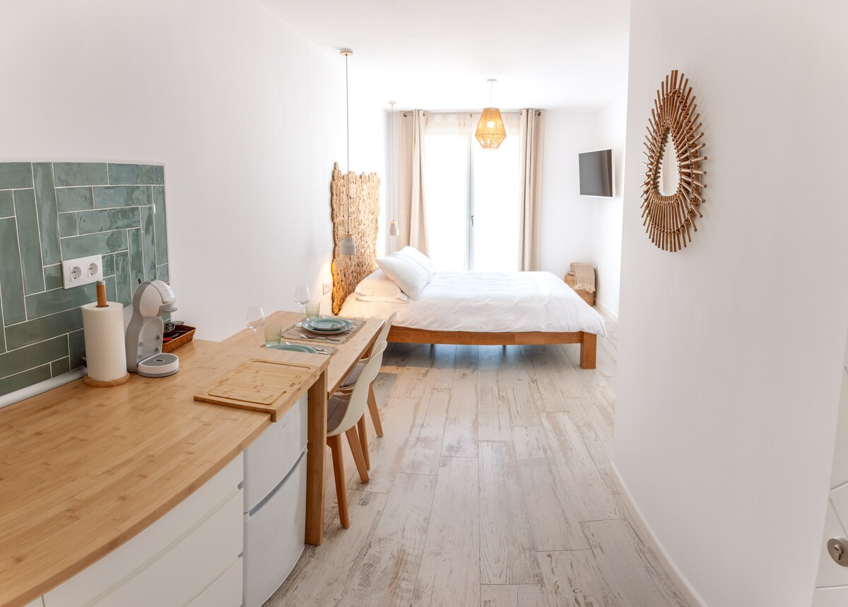 Es un apartamento nuevo en una primera planta, a pocos metros de la playa de Bolonia, con estupendas vistas y maravillosas puestas de sol. Consta de cocina totalmente equipada, baño y habitación con cama de matrimonio, con armario, televisión y wifi.