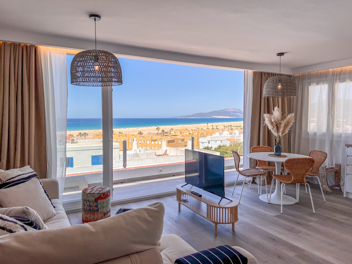 Luxury penthouse, with spacious terrace on the beachfront of Tarifa. 2 bedrooms. Private paid parking. Pool available from June to September. 1 minute from bars and restaurants. 7 minutes from the historic center. Air-conditioned. Fully equipped kitchen with dishwasher, washing machine, microwave, oven... South-facing. Terrace protected from the Levante wind with an electric awning. Crib and high chair available upon request. Penthouse with direct views of the beach. VUT/CA/00044