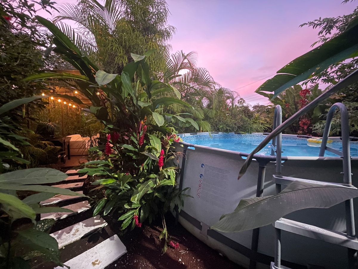 A beautiful cozy house to stay who wants access to Fortuna but want to be out the bustle of town, behind the house you will have a covered terrace with hammocks, table, barbecue; perfect to chill out, eat outside, see the birds and relax. You will enjoy the nature walking around the trails we have into the property and seeing all the tropical flowers.The kitchen has everything you need to prepare something, AC works very good , we are located outsite of the city,so you will need a car.