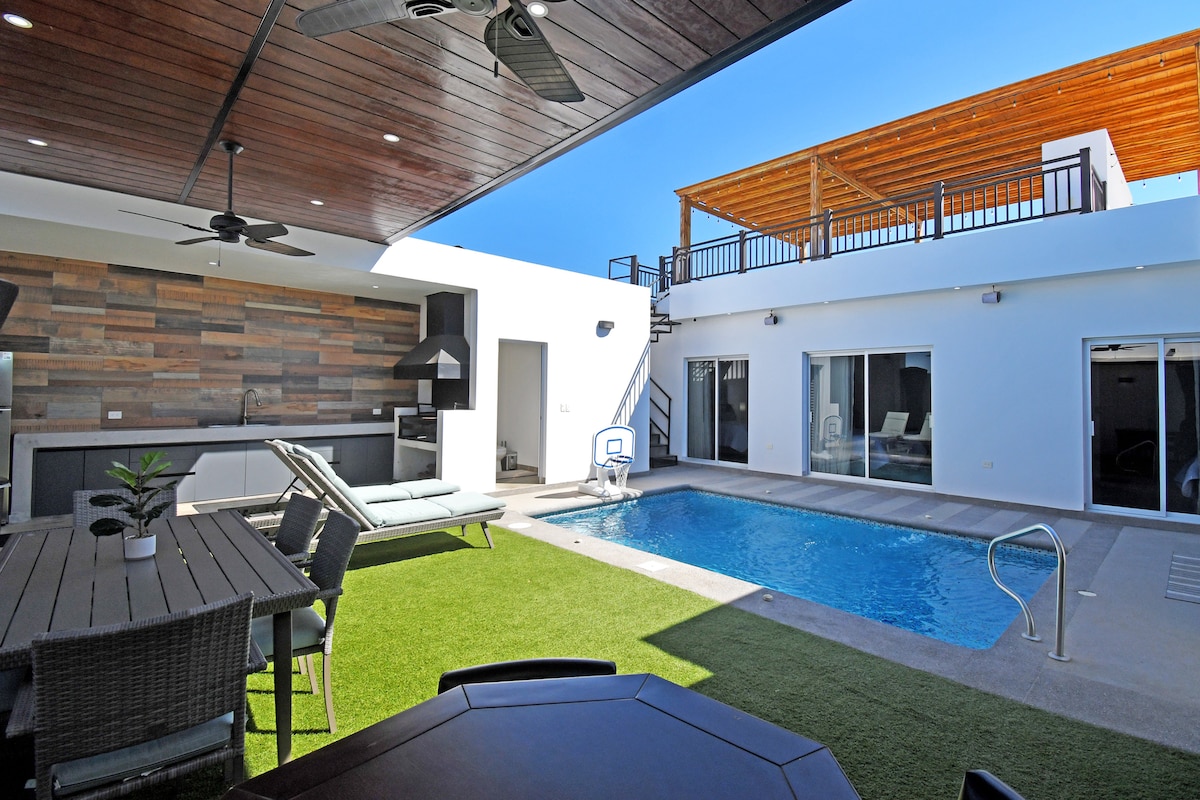 Relájate en esta casa nueva y moderna en El Centenario, una zona tranquila y segura de La Paz. Hospeda hasta 5 personas, con 2 recámaras, 2 baños, cocina equipada, sala, comedor y aire acondicionado. Disfruta del patio trasero con alberca privada, internet Starlink, Netflix, Prime TV y estacionamiento. Ideal para descansar en familia o con amigos.