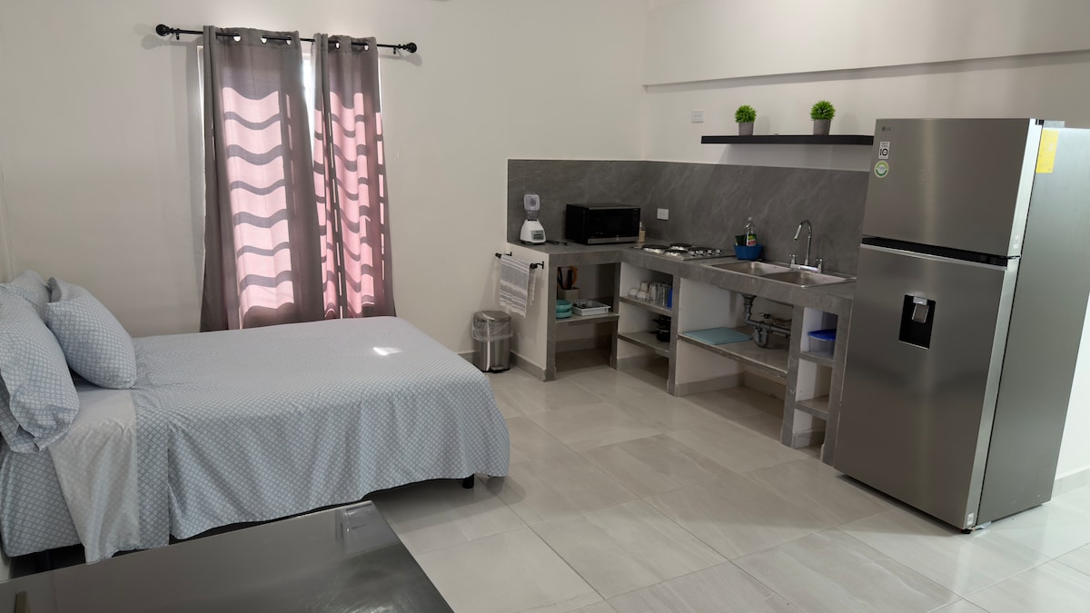 Suite Tamarindo es un departamento tipo estudio integral, ubicado en un complejo de 5 departamentos. Ubicado en un 2 piso, cuenta con una cama queen, smartTV, wifi, aire acondicionado, espacio de clóset, cocina completa, y baño de lujo completo. El complejo tiene estacionamiento cerrado. Está ubicado en un barrio muy tranquilo y cerca del malecón y aeropuerto (10 min en carro). A 600 m hay una playa perfecta para caminar y ver el atardecer. La alberca es de uso compartido.