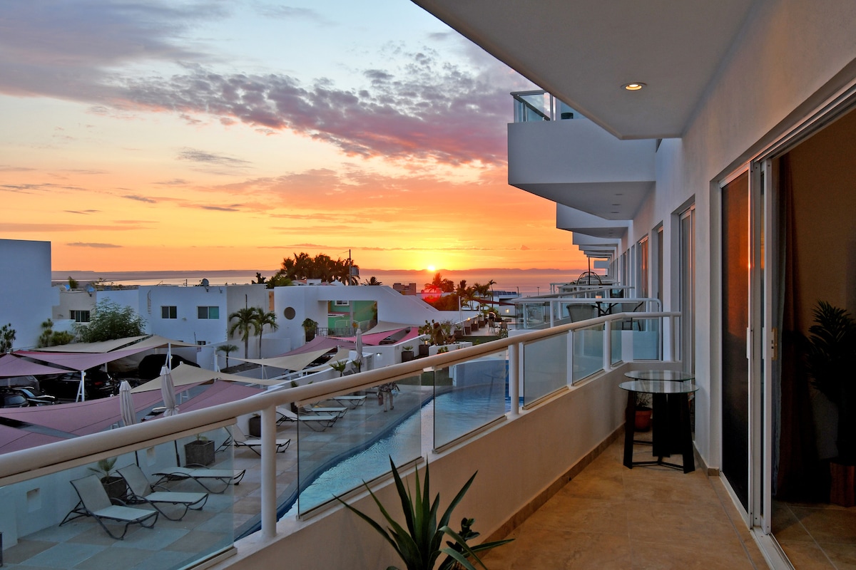 This modern one bedroom condo has among the best views in La Paz. It includes a private balcony, big communal pools with shaded areas, BBQ, lounge seats and comes with gorgeous views of the ocean and sunsets. The condo has all the necessary amenities - washer/dryer, fully equiped kitchen, smart TV, AC and WiFi. Grocery stores, cafes, La Paz's best restaurants & beaches all a few minutes drive away. Safe and quiet area. Gated secure parking. Perfect for your La Paz vacation.