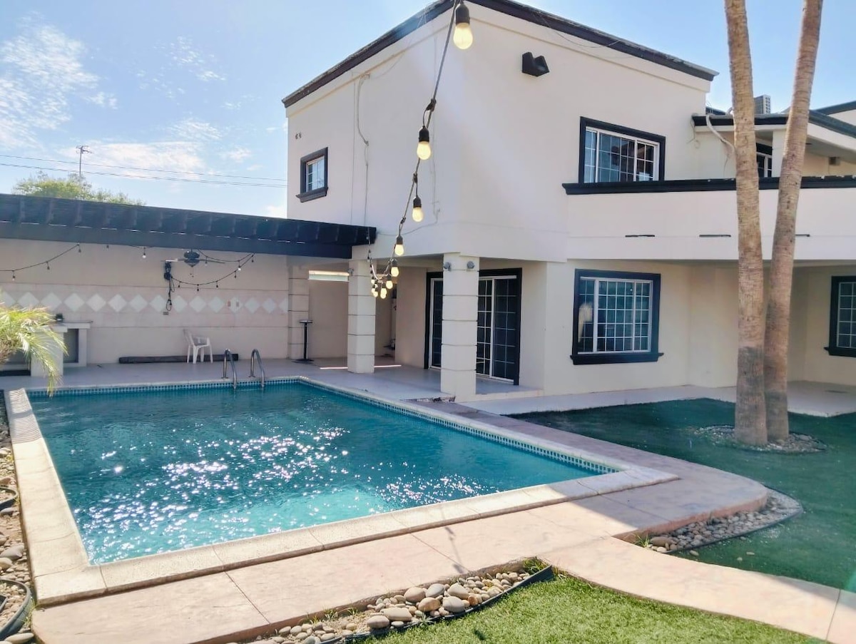 Casa de 2 pisos , equipada tres recamaras con una cama queen cada una, 2 televisiones c/netflix, Lavadora y secadora ,hasta 8 Huéspedes. (2 sillones cama individuales) Estacionamiento para 2 o 3 carros Con todo lo necesario para tu comoda estancia, en el corazón de la zona dorada de Mexicali, en un fraccionamiento privado con seguridad las 24hrs, 7 días a la semana .Cerca de la Gran vía, aeropuerto y garita nueva. Facturamos !
