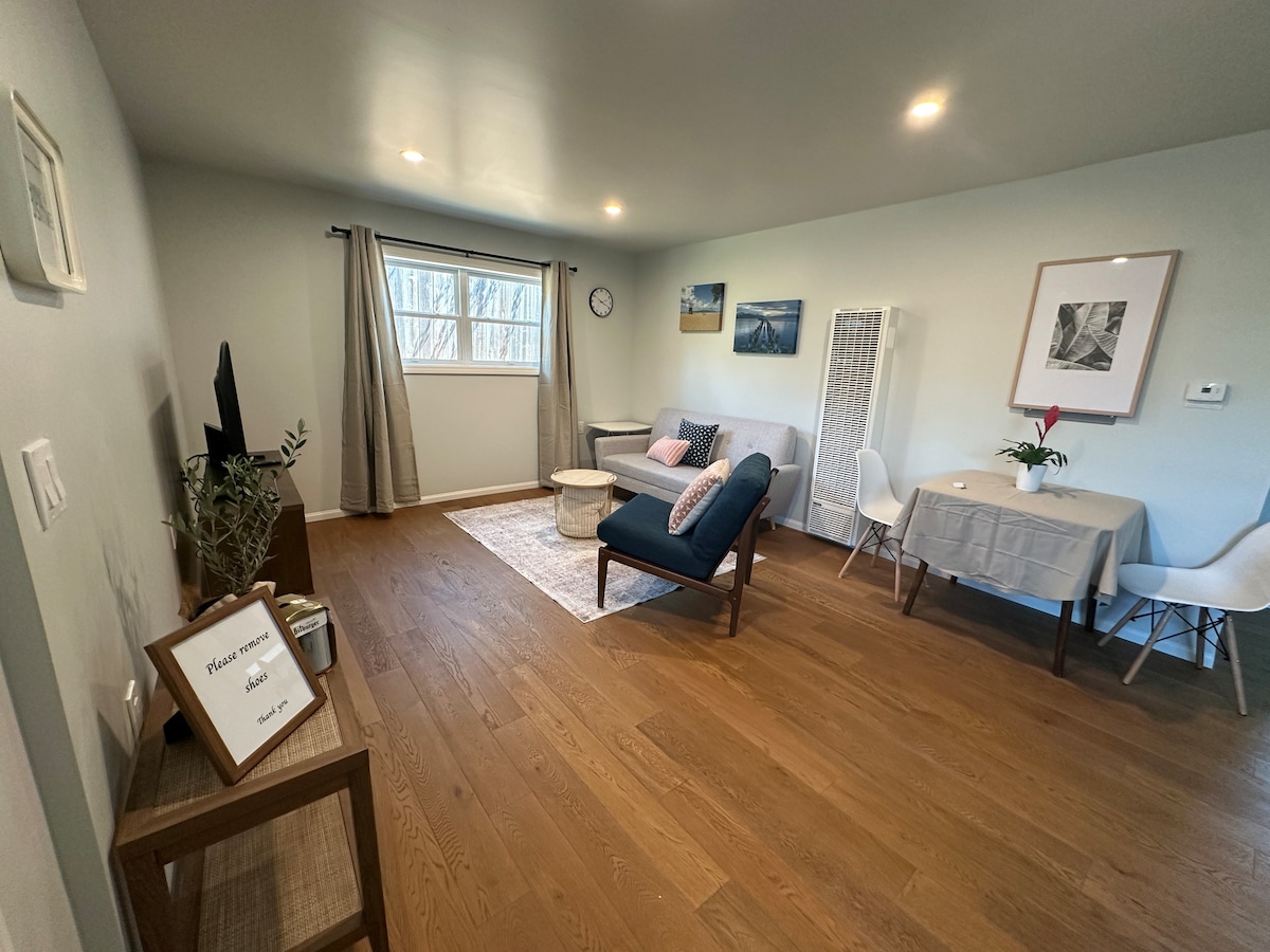 Come and enjoy this 1-bed unit. A cozy and bright bedroom with a comfy Queen bed. The living room consists a dedicated dining area and a relaxing area with sofa and TV. The kitchenette includes a microwave, a small oven and a k-cup coffee maker, but No STOVE. Newly installed heating and cooling air conditioning. This suite is a part of a single family house.The rest of the house is also rented as an Airbnb unit but with separate entrance. The deck area is shared. The entrance is in the backyard.