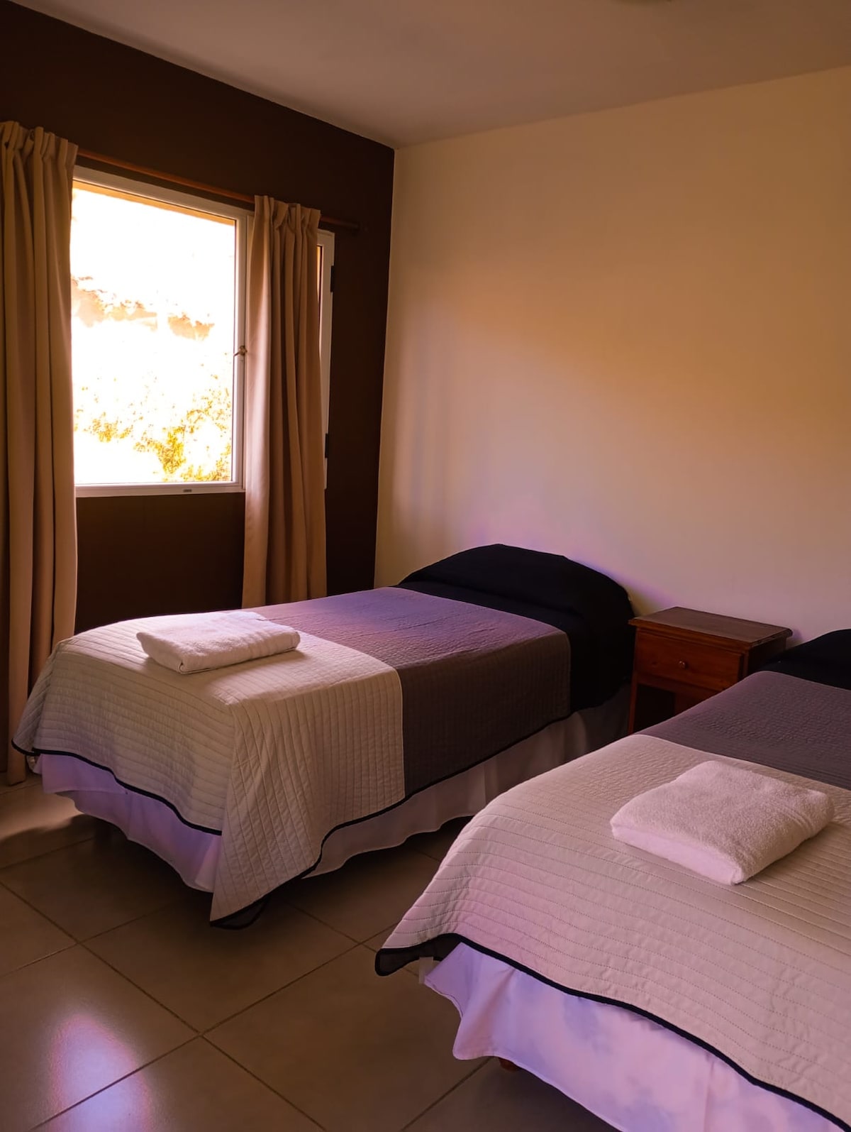 Habitación con dos camas separadas. Luminosa con vista a la calle trasera. Las habitaciones cuentan con mesas de luz, espacio de guardado de valijas y ropa, perchas y caja de seguridad. Baño privado con ducha y elementos básicos de higiene personal. Nos encontramos en Las Lengas 60.