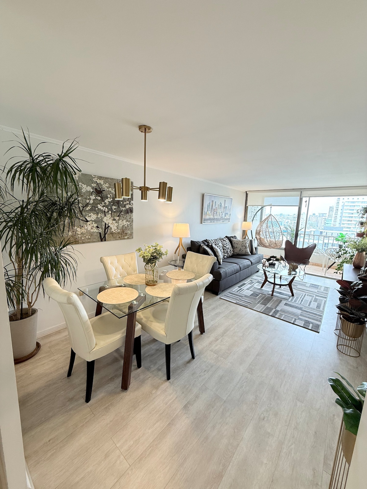Moderno departamento con espectacular vista a la cordillera, a pasos del Mall Parque Arauco. Piscina temperada, gimnasio, seguridad 24h y estacionamiento. Dos habitaciones, cama king + 2 camas individuales, sofá cama de dos plazas en la sala, 2 baños, terraza cerrada con protección en ventanas, ideal para familias. Lavadora/secadora, lavavajillas, Wi-Fi alta velocidad y escritorio de trabajo. Totalmente equipado para estadías cómodas, seguras y funcionales.