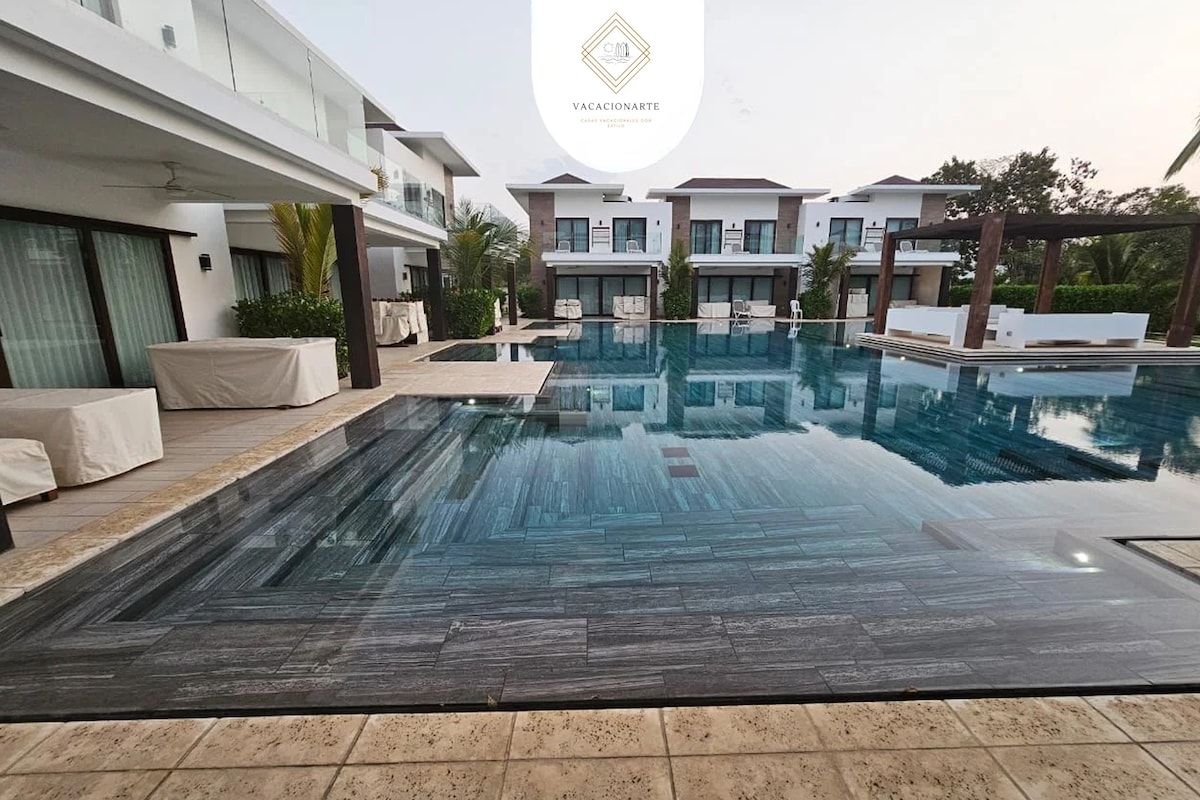 Con tu familia crea recuerdos inolvidables en esta casa en condominio seguro, con cocina moderna completamente equipada. Piscina privada grande con diferentes alturas para todas las edades, y múltiples sombrillas para tener sombra en la piscina. Acceso privado a la playa. Mesa de Ping-Pong, Juegos de niños y jardín de 500 metros para juegos al aire libre. Duerme cómodamente en 5 habitaciones con aire y TV, 16 camas en total. Parqueo para 4 carros dentro de la propiedad, más parqueos de visita.