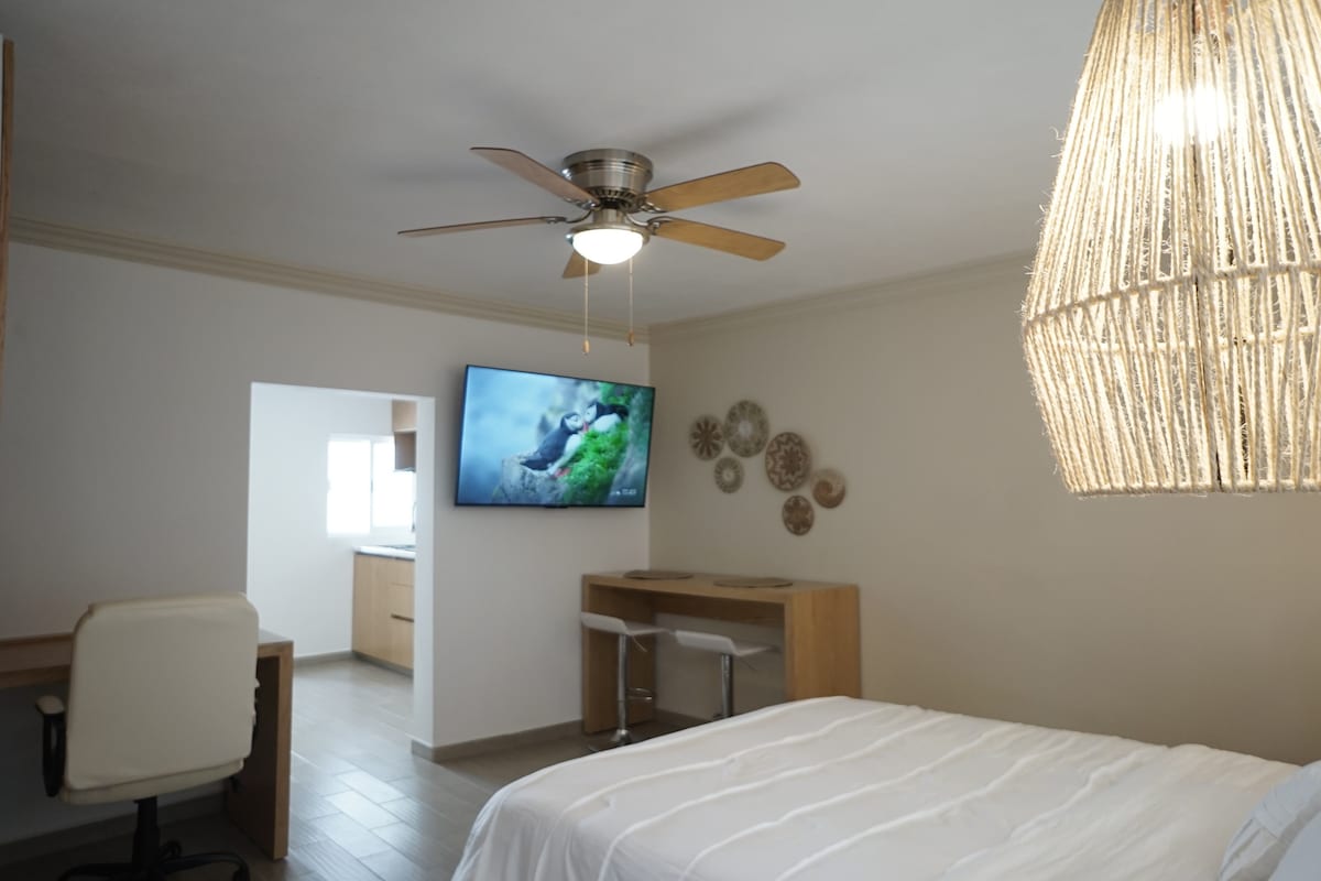La suite esta equipada para brindar el mayor confort. Descanse en su cama con colchón memory foam mientras ve una película en la smart TV, WIFI alta velocidad. Disfrute de un buen baño en una regadera con acabados de alta calidad. Trabaje sin preocupaciones en el escritorio contamos con wifi de alta velocidad. Prepare comidas en la cocina totalmente equipada, en esta suite tendrá todo lo necesario para una estancia corta o larga.