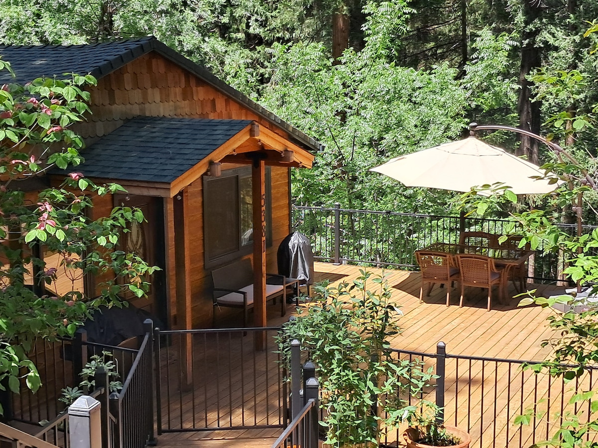 Welcome to our romantic getaway for two! This historic miner's cabin, which has been renovated, is located in the heart of Apple Hill, in the Sierra Nevada foothills, and overlooks a small meadow and creek. Walk to nearby farms, breweries & wineries or just relax on the back deck and enjoy the scenery. Visit nearby historic Placerville, its galleries, restaurants, shops & more! Raft, ski, kayak, or just explore our 40-acre farm trails! (We are pet friendly.)