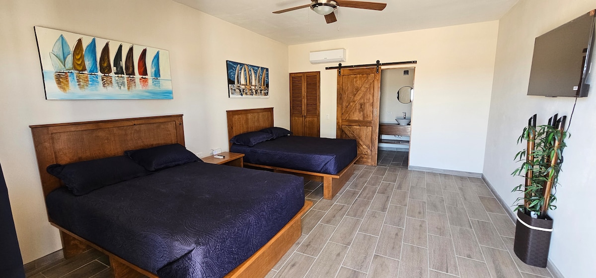 Watch the sunrise or stroll to the beach or the cantina from our Baja Beach Bungalow located in safe and secure Pete's Camp. Just 200 yards from this unique 2 Bedroom house offers clean, comfy sleeping spaces, 2 full bathrooms, beautiful views and plenty of parking. The house has a full kitchen and bedroom #2 has a small mini fridge, sink and microwave separate bathroom. Our place comfortably sleeps up to 9. 3 queen mattresses 1 twin mattress 1 futon 2 sofas
