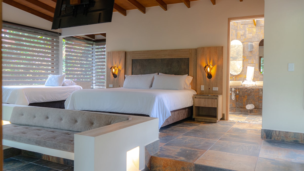 Disfruta del encantador entorno de esta romántica villa en medio de la naturaleza, ideal para una estadía llena de lujo y confort con tu pareja. Ubicada en el corazón turístico del eje cafetero, una de las regiones más visitadas y hermosas de Colombia. By AMANATU Ecolodge & Spa