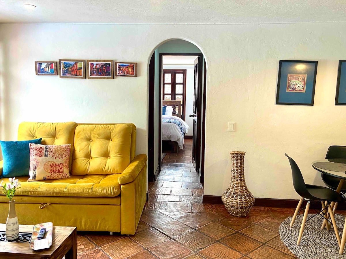 Hermoso apto en la calle mas linda del centro histórico. Romantico, autentico, acogedor, tiene mucha luz natural, temperatura agradable, hermosas vistas 360º a la ciudad y las montañas desde todos los espacios del apto. En el primer piso está la cocina abierta, sala, chimenea y balcón privado. Baño recién restaurado y habitacion con cama doble muy confortable y con ventana hacia la ciudad. Y para completar una linda experiencia, un altillo con vista al atardecer y hamaca para relajarse.