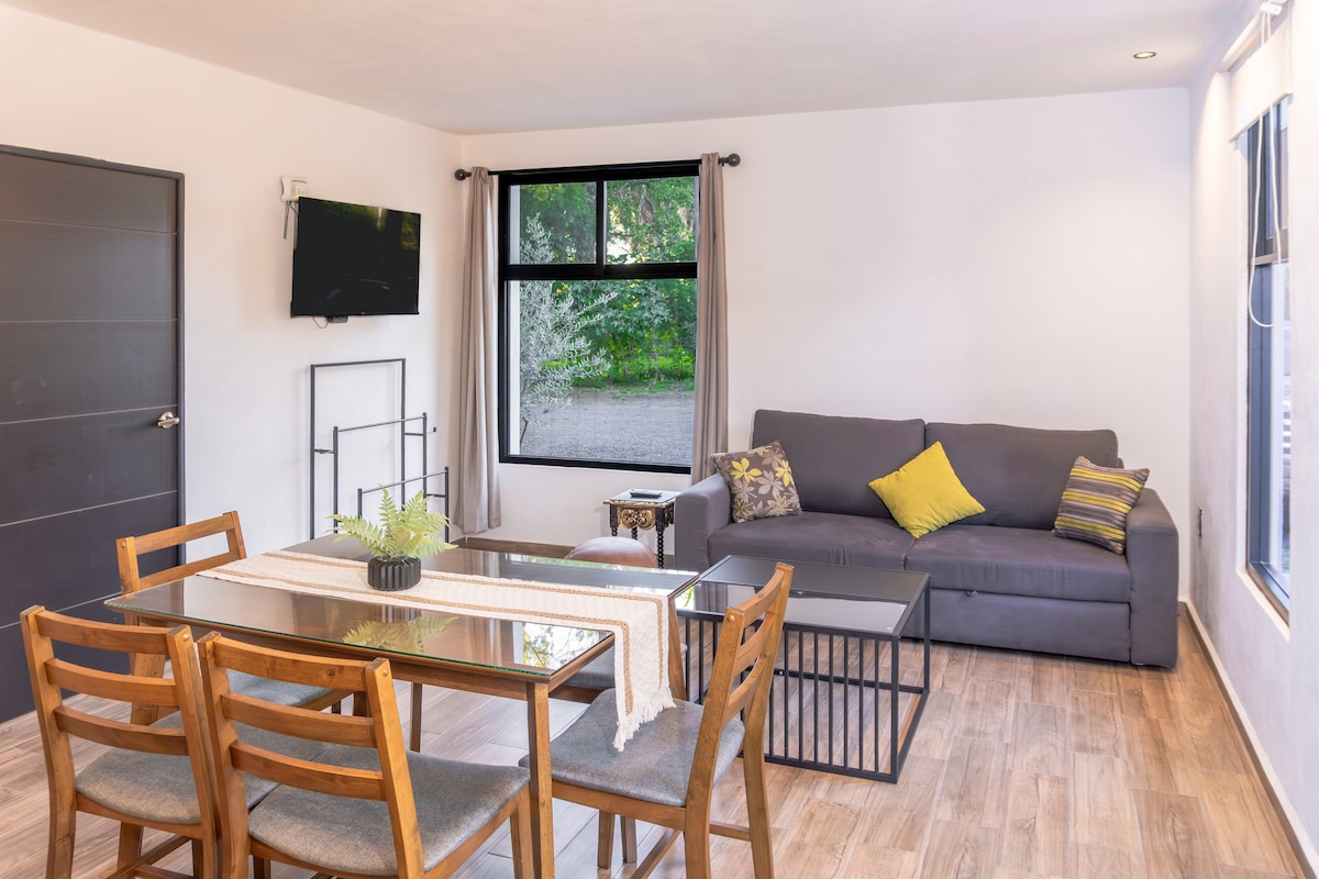 Relájate en este espacio tan tranquilo y elegante, lleno de vida con su hermoso jardín, su relajante jacuzzi, la espectacular televisión de 75 pulgadas en la sala, para ver tus películas y series favoritas. Además está muy bien ubicado para disfrutar de Tequisquiapan y sus alrededores plenamente, como sus queserías, viñedos, globo aerostático, cuatrimotos, caballos, restaurantes, bares y recorridos. No dejes de visitar la Peña de Bernal, las minas de ópalo, etc.