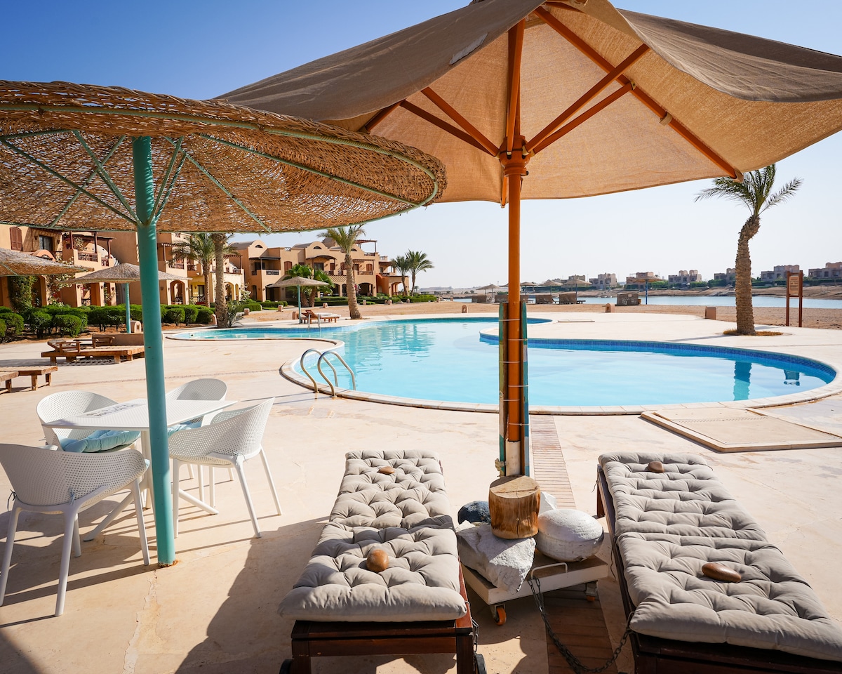 Enjoy being in El Gouna’s downtown and staying directly on an open sea lagoon at my charming beachfront home. Whether you spend your mornings on the terrace or the beach, you can relax in privacy and quiet - forgetting that you're a 5 minutes walk from downtown shops and restaurants. Book this quaint beachfront home to enjoy a swim steps from your door and still be a 5-minute walk from the bustling downtown for dinner.