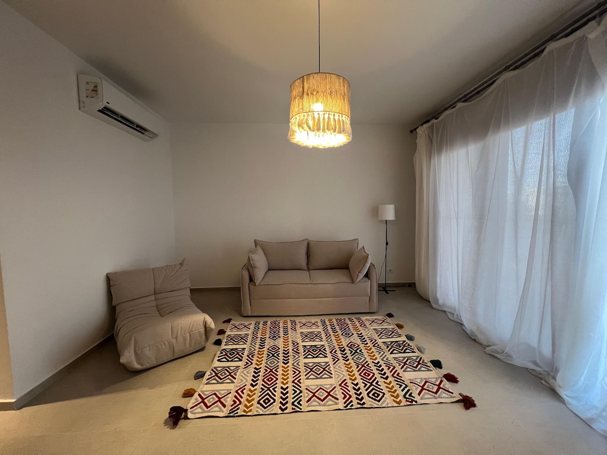 80 m2 flat with 2 bed rooms , 1 bathroom air-conditioning, washing machine, cooker , big smart TV ,big sofa , nice balcony with sea view , WiFi, parking , swimming pool