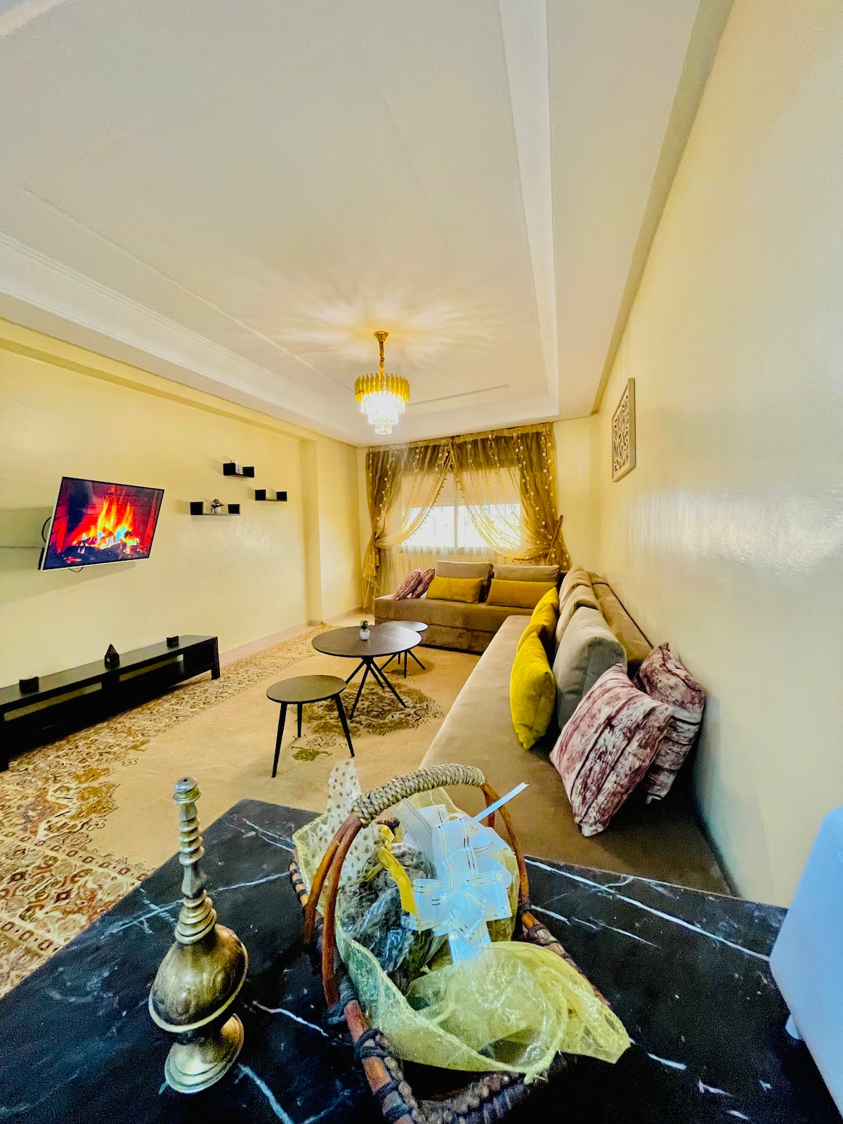 Appartement Élégant avec Terrasse Bienvenue dans ce magnifique appartement alliant modernité et confort, idéalement conçu pour un séjour relaxant. Situé au rez-de-chaussée, ce logement lumineux et spacieux Il se trouve à seulement 5 minutes en voiture de la plage, le centre commercial Carrefour est à 3 minutes à pied Que vous soyez en couple, en famille ou entre amis, cet appartement vous garantit un séjour agréable. Pour les couples marocains, il est important de présenter un acte de mariage.