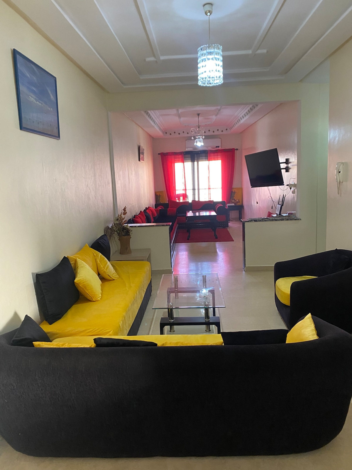 Modern, bright apartment on the 4th floor of a well-maintained residential building on Avenue des Facultés in El Jadida opposite side of the cafe olé. Quiet and safe location, just a few minutes from the beach, old town, and university. The apartment offers one bedroom with a balcony, two living rooms , a kitchen, a bathroom, TV with IPTV and Wi-Fi. Ideal for couples, travelers, or longer stays – central, comfortable, and well equipped.