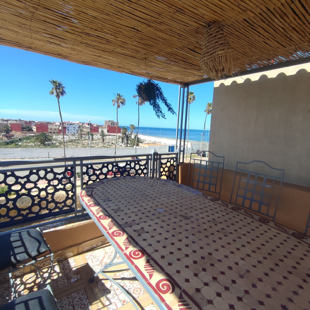 Notre spacieuse maison de 3chambres est l'endroit parfait pour des vacances relaxantes . Située directement sur la plage avec de vues imprenables depuis la terrasse privée. Les 3 chambres sont confortablement meublées, offrant un espace de rpour 8personnes . Le salon est lumineux avec des canapés marocains .La cuisine est entièrement équipée, deux la table à manger sur la terrasse et en plein air. la plage juste devant votre porte, les attractions locales à proximité et les sites historiques.