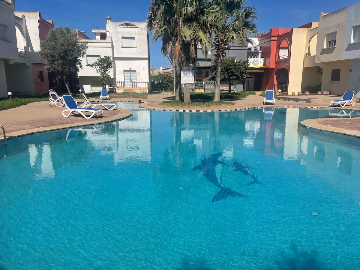 Appartement moderne 2 chambres à Bahara avec 1 lit double, 2 lits simples, Wi-Fi et 2 terrasses (avant & arrière). Grand salon, cuisine équipée, salle de bain complète. En face du City Club, à 16 min à pied de la plage. Parking extérieur gratuit et piscine l’été (juin–août). Réservé aux familles et couples mariés – certificat de mariage ou pièce d’identité requis.
