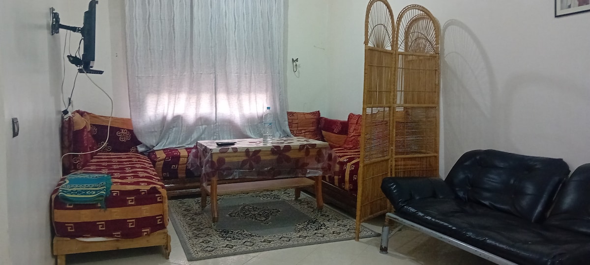 Welcome to our modern, cozy apartment where comfort meets style. Enjoy a bright living room with navy sofas, a sleek kitchen, and a dining area for six. The space includes fast WiFi, a flat-screen TV (Bein sports, IPTV service), and elegant décor. Large windows fill it with natural light and calm energy. Just 3 mins to the train station, 2 mins to Carrefour and 5min driving to the beach & City Center…(not allowed to unmarried couples) Perfect for relaxing short or long stays.