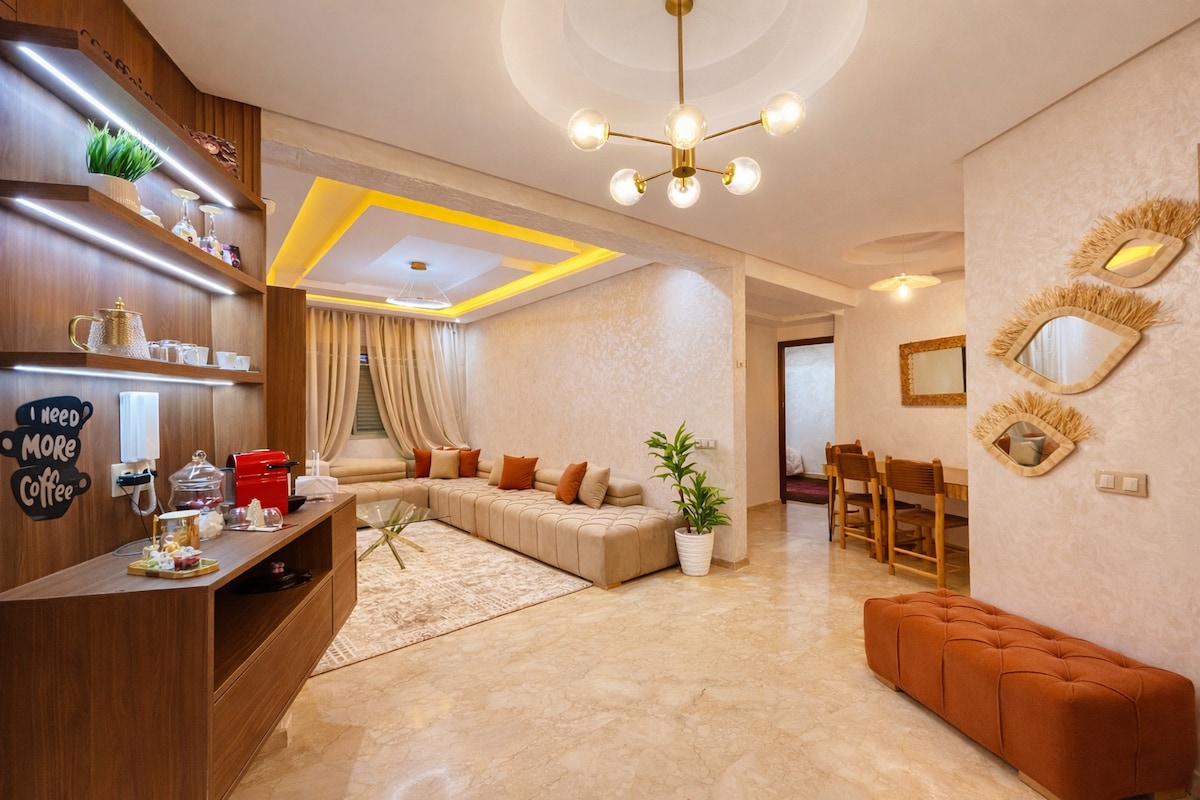 Appartement moderne et neuf au cœur d’El Jadida, à 5 min à pied de La Belle Galerie, Carrefour et BIM, et à 10 min de la plage et de la corniche. Idéal pour familles ou amis, il offre 2 chambres (3 lits), un grand salon lumineux, une cuisine équipée et une salle de bain moderne. Résidence sécurisée, parking sous-sol gratuit et vue panoramique. Proche des meilleurs restaurants et commerces. Parfait pour un séjour calme et confortable.