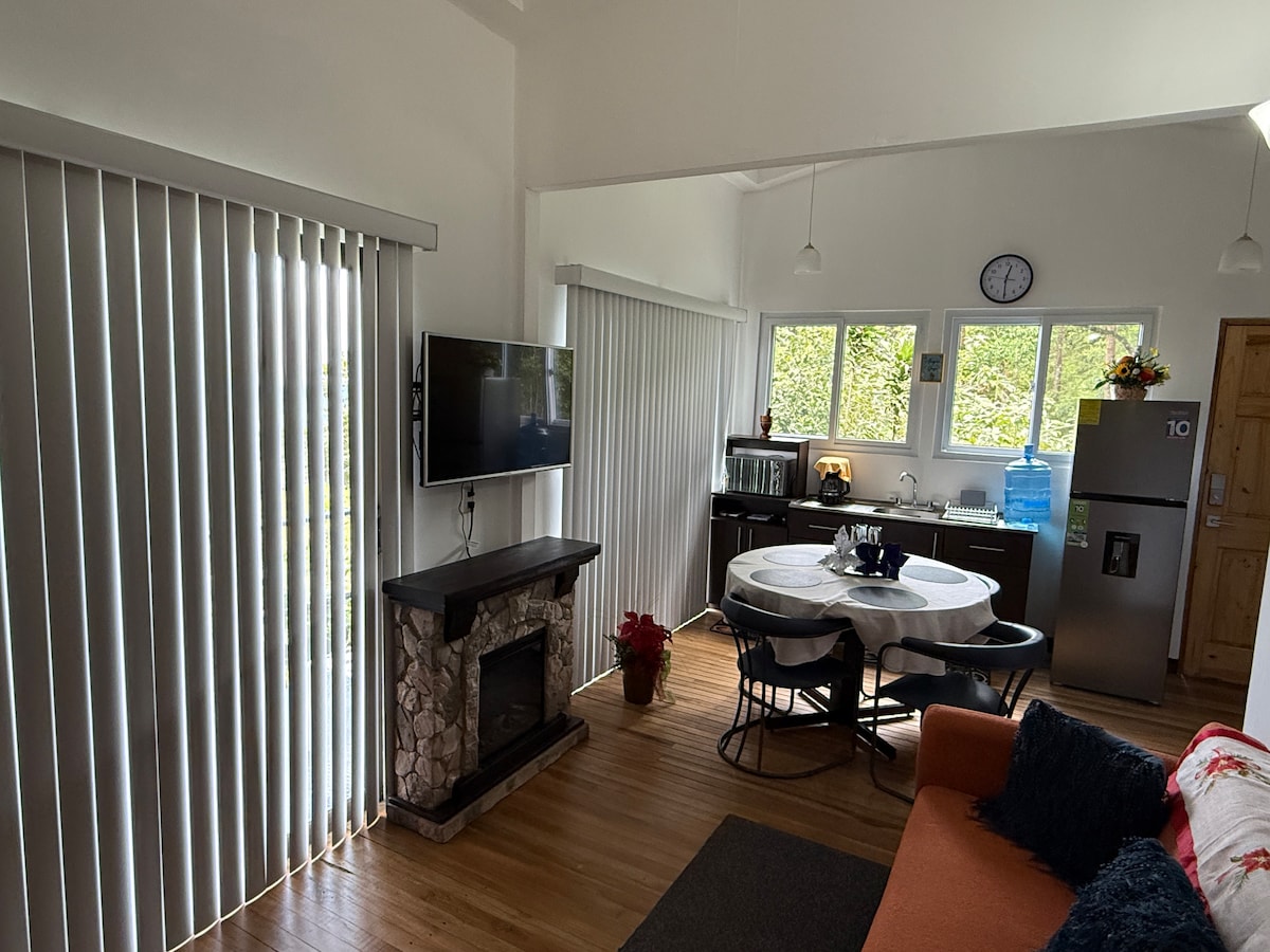 Acogedora Cabaña Rural con acabados de madera , 100 % equipada , 3 habitaciones, cocina, sala de estar, chimenea, área de aparcamiento privada , áreas verdes para picnic y de esparcimiento . Contamos con Wi-fi apto para teletrabajo. Accesible ,sin escalones , accesos amplios . Pet friendly Ubicada en la Cima de Dota a solo 1 hora y 30 min de San Jose, a 20 minutos de Santa María de Dota y a 45 minutos de San Gerardo de Dota . A 30 min del Parque Nacional los Quetzales .