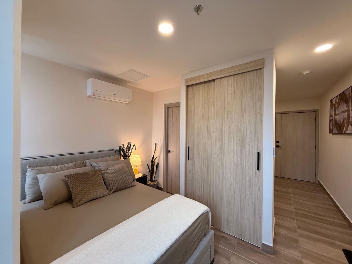 Disfruta de una estadía moderna y cómoda en un espacio minimalista y elegante, ideal para descansar o trabajar. Cuenta con cocina equipada, Cama, Sofá cama, TV, AA, Cable+Internet, baño privado, área de lavanderia y estacionamiento gratis. Ubicado en una zona céntrica frente a UNAH, con excelente vista de la ciudad. Tienes cerca comercios, restaurantes, bancos, supermercados y diversas zonas de interés de la ciudad. El sitio perfecto para viajeros solitarios, parejas, amigos o ejecutivos.