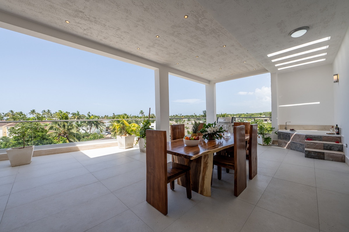 This brand new penthouse is centrally located, just a 3 minutes walk to the beach. Between town and the beach: Punta Popy. The penthouse is unique by the beautiful (Ocean) view, large terrace, private jacuzzi, and BBQ. It gives you the feeling that you are in a honeymoon suite. Enjoy the beautiful surroundings from the jacuzzi with a glass of champagne. Feeling home, away from home. There is a generator back up system and an elevator in the building. Fiber internet connection.