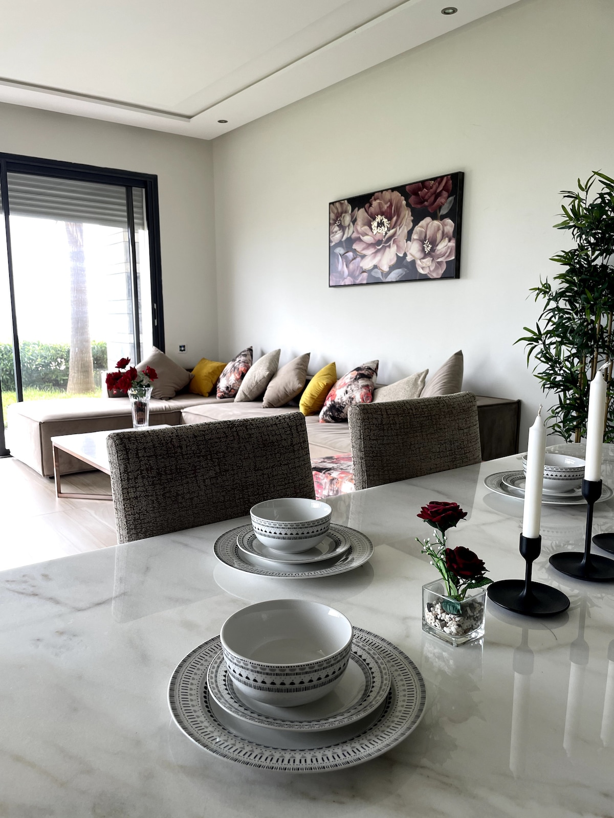 Ilova company is proud to offer this bright and fully equipped appartement on first floor of a quiet &secure neighborhood Mohammedia central. 5 mins drive to serene beaches & steps away from supermarkets, cafés, restaurants, train station, with easy access to major highways. Enjoy a modern living room with traditional Moroccan touch, fully equipped kitchen, balcony, 100 Mbps fiber-optic Wi-Fi, and adedicated workspace, perfect for remote workers. Free and secured parking is available. Book Now
