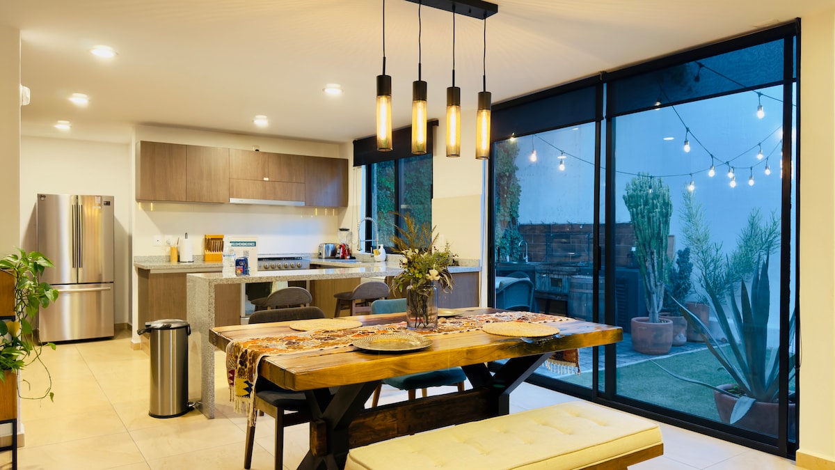 Welcome to Casona del Buen Huerto, a stylish 2-bedroom, 2 bathroom retreat located in the historic center of Querétaro, featuring an outdoor garden with a tranquil fountain and designer details throughout. This modern home offers the perfect blend of contemporary comforts and classic charm, all just steps from the city’s vibrant plazas, shops, and restaurants.