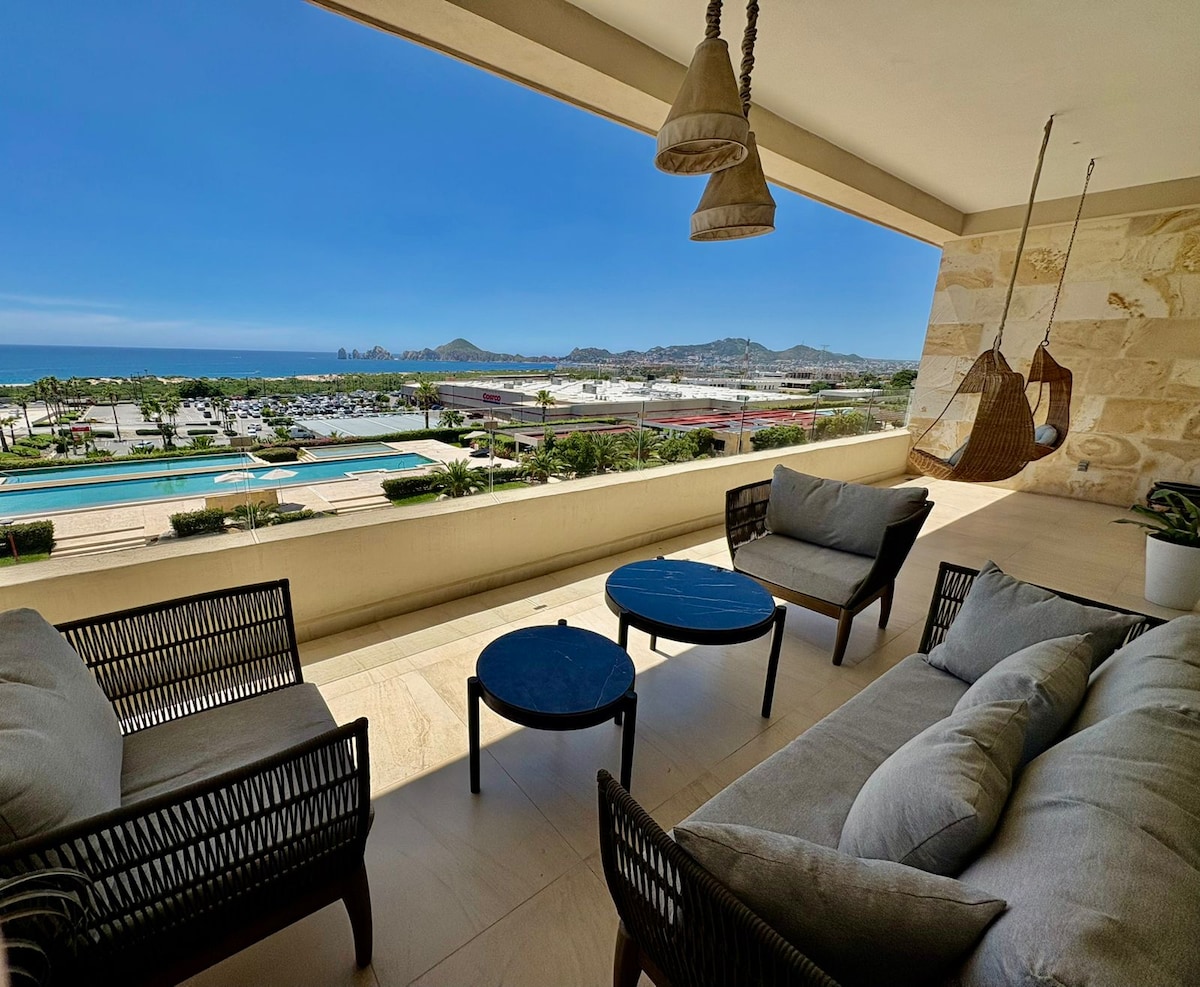 Welcome to your spectacular ocean-view condo! - Brand new, modern space with luxury marble finishes. - Two bedrooms with en-suite bathrooms and air conditioning throughout. - Large terrace for dining with stunning ocean views. - Access to an infinity pool, gym, and tennis court in the secure complex. - Conveniently located just minutes from El Médano Beach and downtown Cabo San Lucas. - Complimentary WiFi and parking included.
