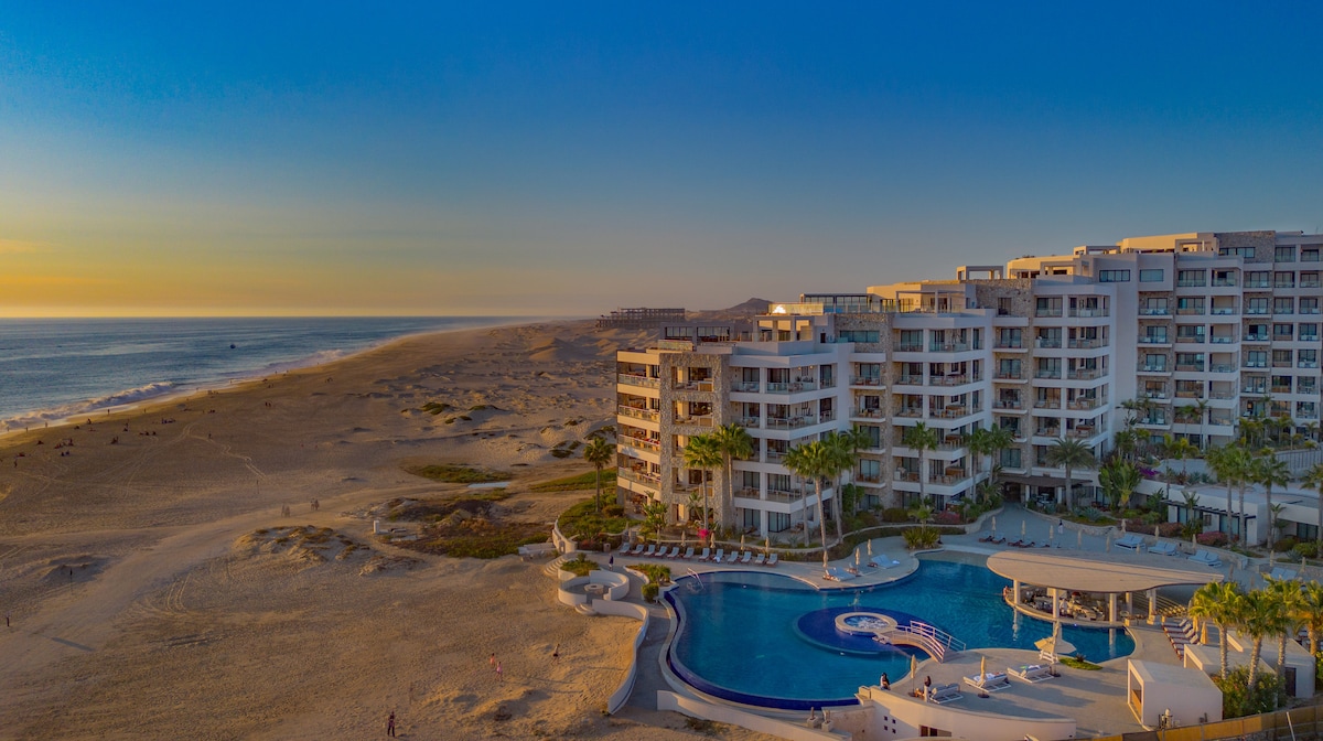 Beachfront Luxury Studio in Exclusive Diamante Golf and Beach Resort. Private Ocean View Terrace, fully equipped Kitchenette, TV & Sonos Sound System. Access to Amenities including 10 Acre Crystal Lagoon, Water Park, Spa, Fitness Center & restaurants. Along the secluded coastline of Cabo San Lucas we have two of the most spectacular golf courses in the world; Dunes Course by Davis Love III, El Cardonal by Tiger Woods, and a TGR Design par-three Oasis Short Course. Miles of white sand beach.