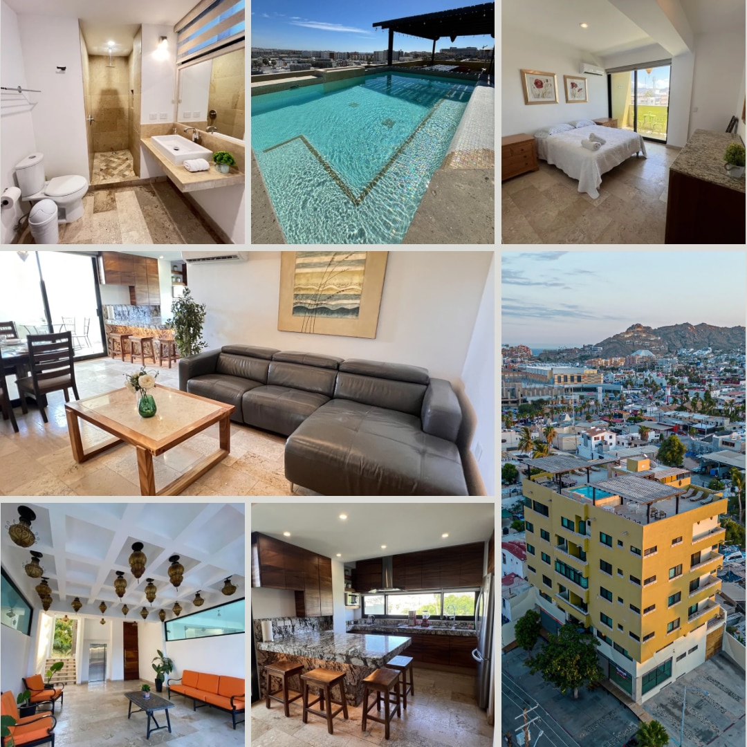 SPECTACULAR VIEWS just a 5 minute drive to the Arch Landmark and incredible Medano beach. Manager available to help you, airport pick ups for a better fee. Rooftop Pool, hottub, firepit and gym equipment. Full length mirror. Front desk 24/7 Concierge is included for your reservation by contacting Fernando our co-host. Restaurants and coffee shops near. We would love to assist you to make your vacation perfect. We recommend contacting our manager for airport transportation.