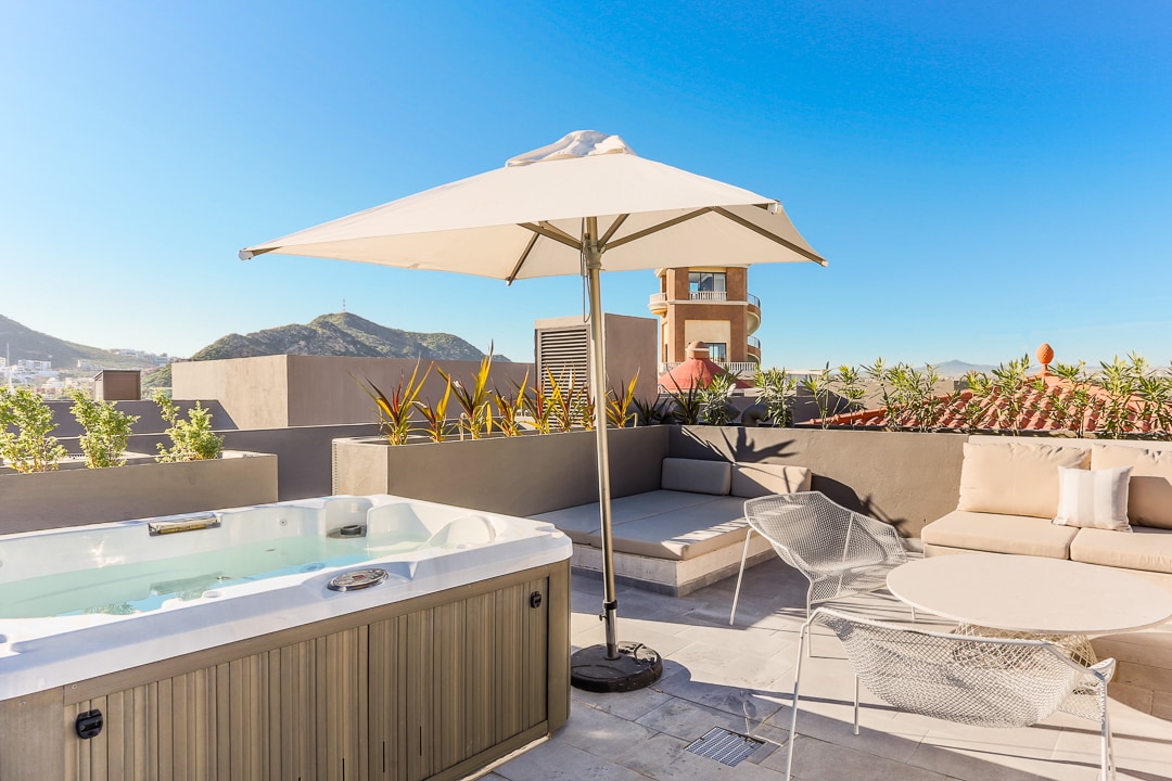 THE PARAISO RESIDENCES. Inthe heart of the Marina. 2 bedrooms 2 bathrooms. Full kitchen, patio with grill, upgraded linens, washer and dryer and private rooftop deck with private hot tub. 5 minute walk to Medano beach. Walk to all downtown locations, nightlife and restaurants. Secure location with concierge on site and 24 hour security. Beautifully appointed with everything you need for your stay.