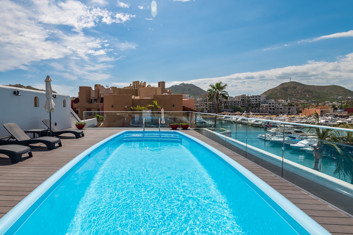 ¡Disfruta de este hermoso loft panorámico con jacuzzi privado, ubicado en la Marina de Cabo San Lucas, El espacio ofrece comodidad, privacidad y una vista espectacular, ideal para disfrutar Cabo caminando a restaurantes, bares, tours y vida nocturna. El loft está preparado para hasta 4 huéspedes, con cama King Size y sofá cama Queen Size, perfecto para parejas, amigos o familias pequeñas. Después de un día en la playa, relájate en el jacuzzi con vista a la marina.