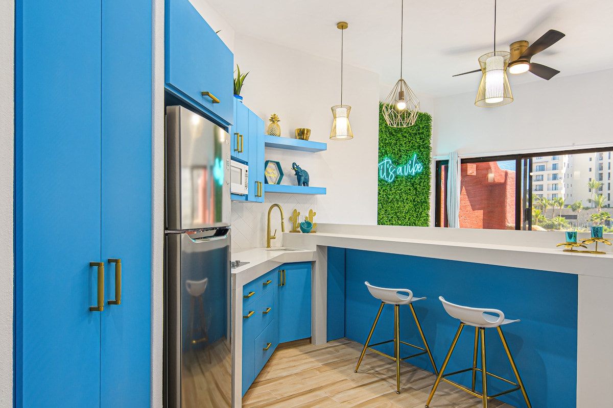 NEW Condo Azul is newly furnished, ready to cook kitchen w/ brand new GE Profile stainless steel appliances w/ dishwasher. Azul features one bedroom with queen sized bed, individual air conditioner with remote control, ceiling fan, closets. The living room is filled with plenty of natural lighting, a pull out queen sofa bed and Smart TV. High Speed Internet. Washer and dryer at balcony. Rooftop pool, pergola and stunning ocean views. Medano Beach access is just few minutes away.