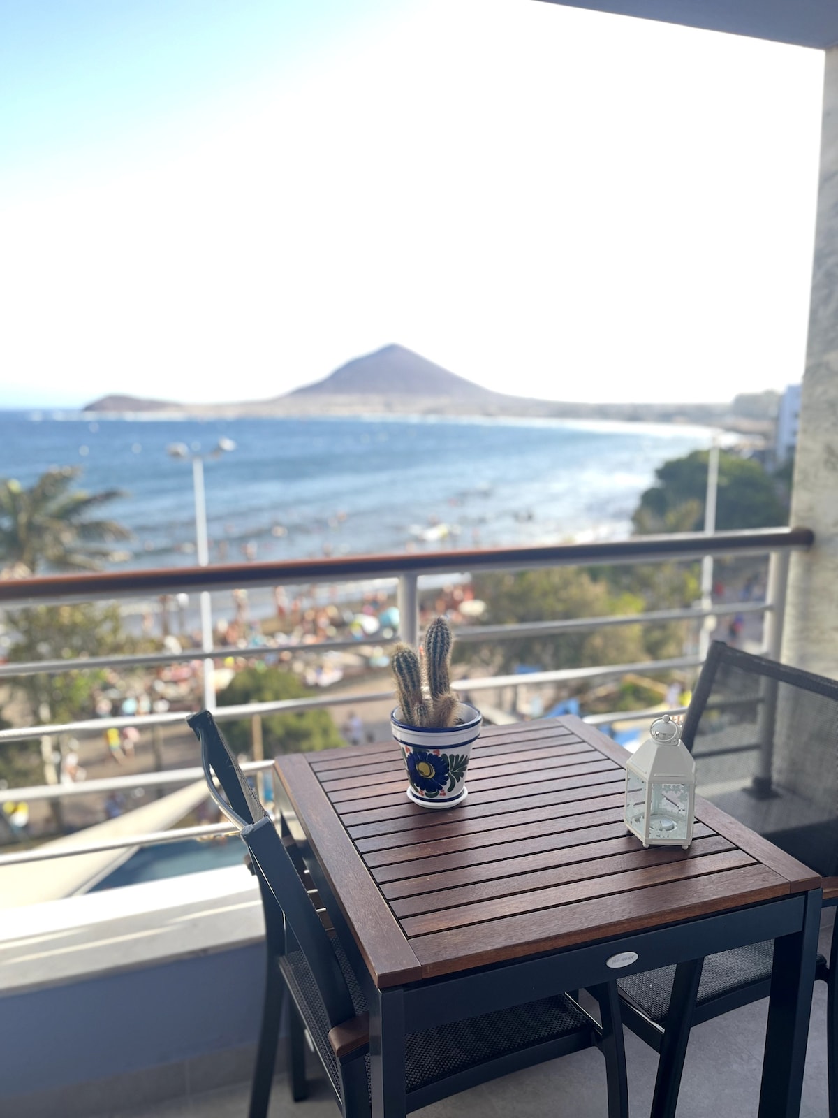 Beautiful apartment facing the sea, with a perfect location in the Médano, 5 mt from the beach walking, first line, with glass balconies that open to a terrace, from the living room, and the main room. They can accommodate 4 people and a baby, since it has a double bed, two single beds, a sofa bed and a cot. Easy access to the building, with two entrances, one to the beach and another to the street..